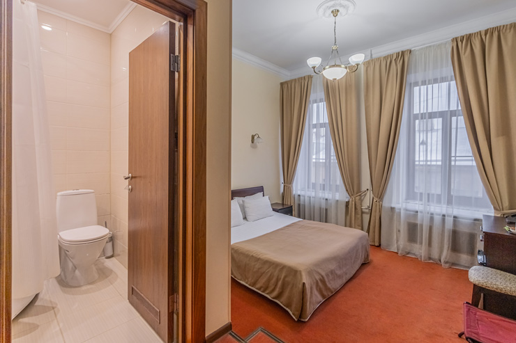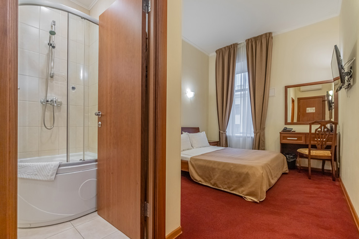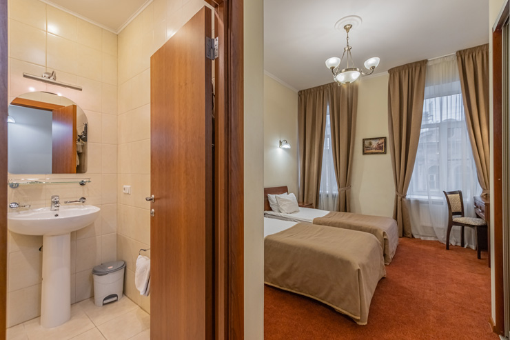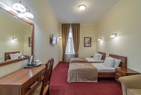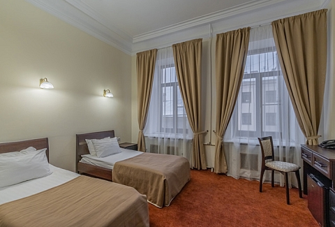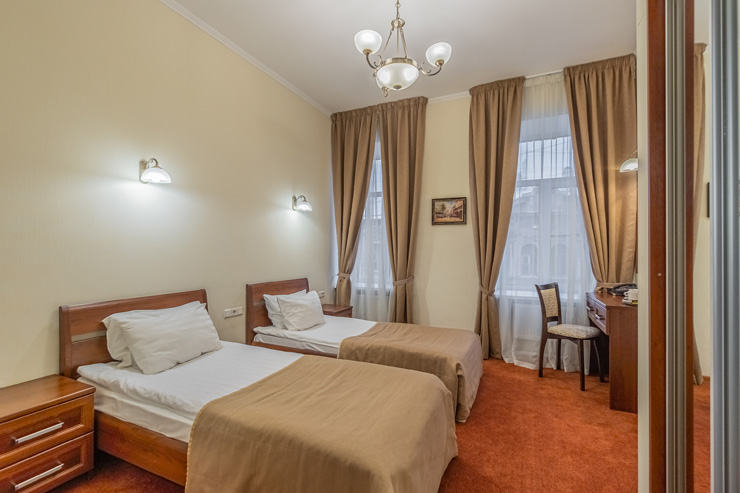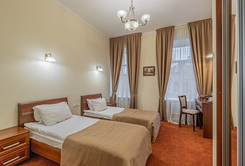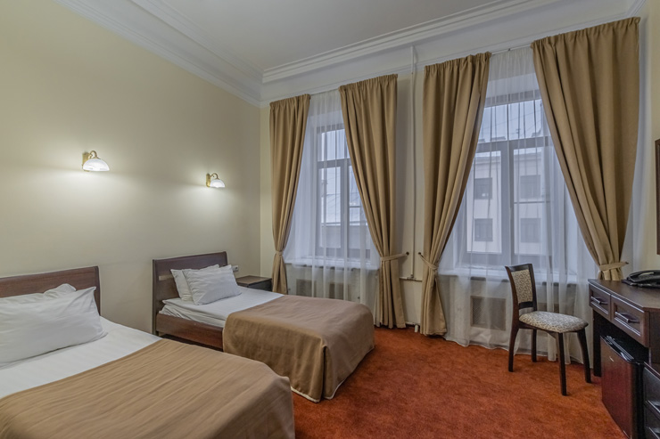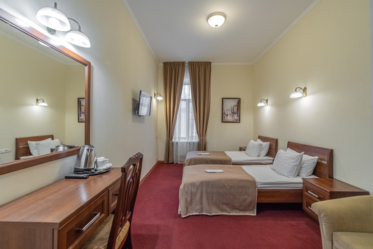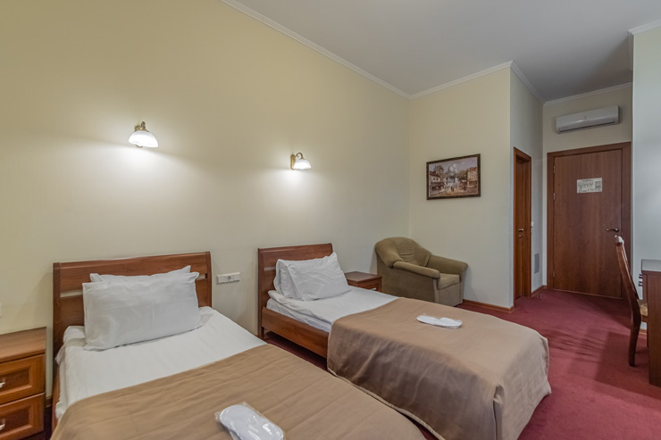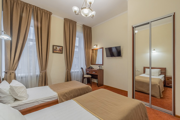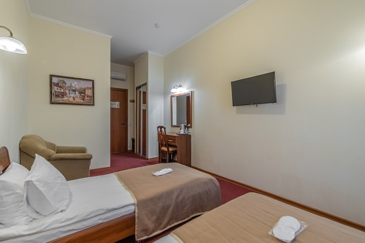 В номере: вешалка, зеркало, кровати односпальные, прикроватные тумбочки, стол, стулья, шкаф, мини-холодильник, сейф, телевизор, электрочайник