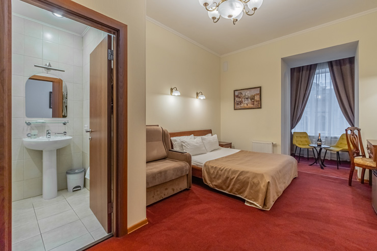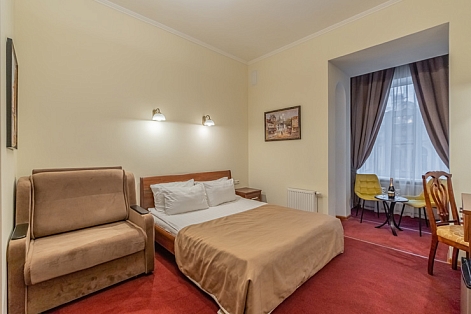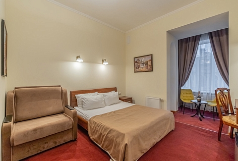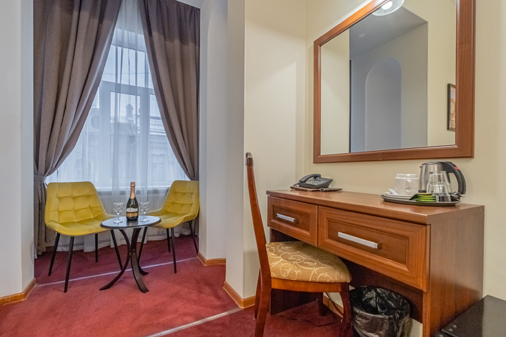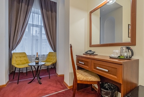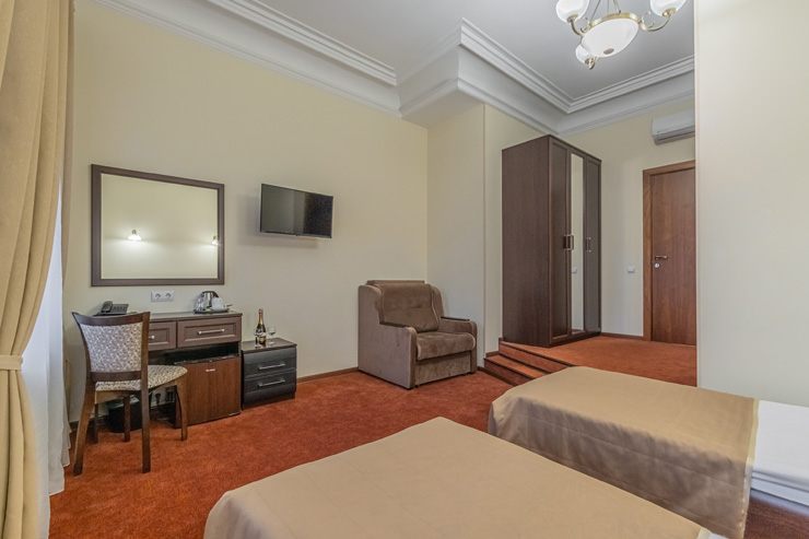 В номере: вешалка, зеркало, кресло-кровать, кровати односпальные /одна двуспальная кровать, прикроватные тумбочки, стол, стул, шкаф, кондиционер, мини-холодильник, сейф, телевизор, телефон, чайная станция, чайный набор посуды, электрочайник
