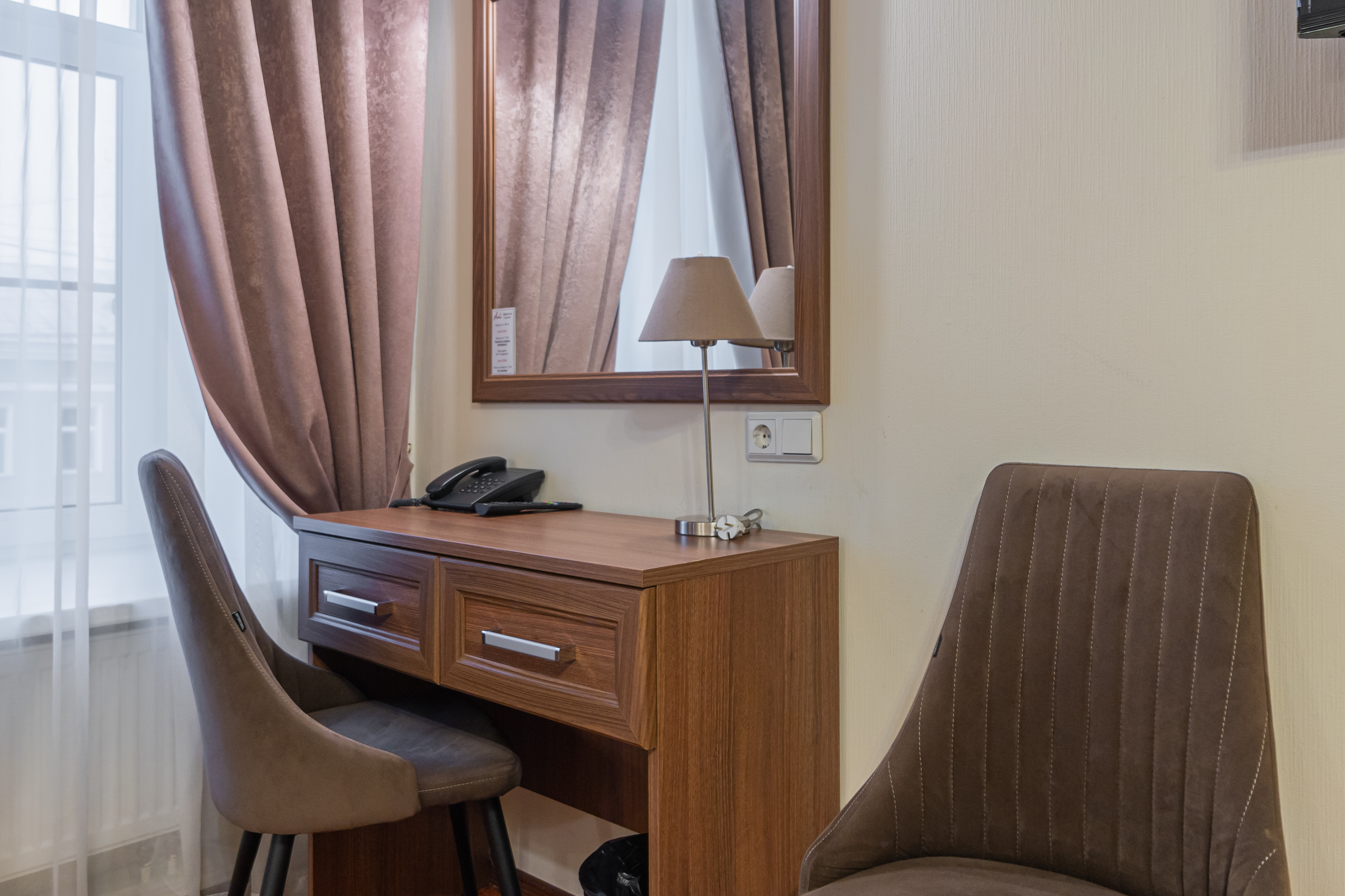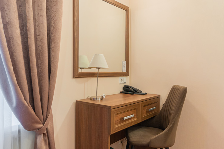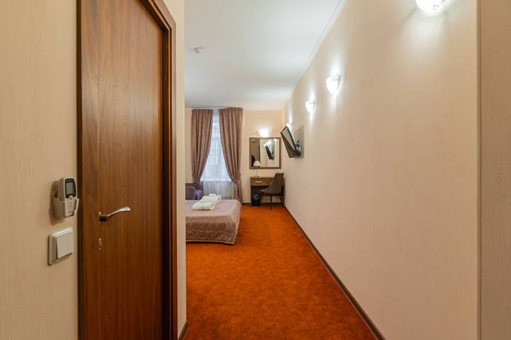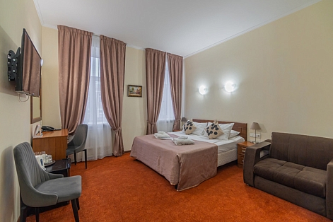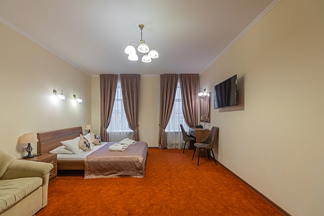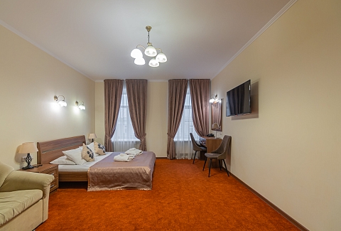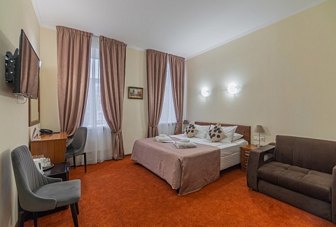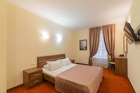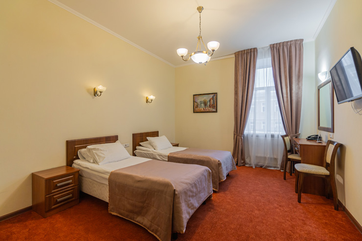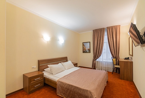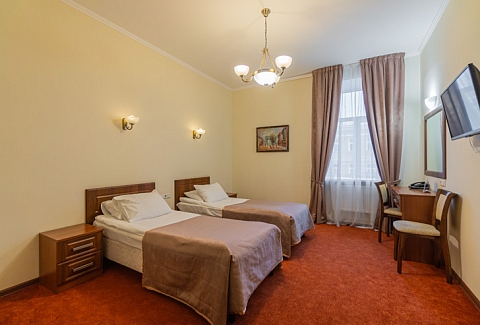 Достоевского, сквер Эдуарда Хиля. Рядом с отелем функционирует разнообразные кафе и рестораны, магазины и прочие объекты социальной инфраструктуры. Расстояние до аэропорта составляет 22 километра, до железнодорожного вокзала – 3,3 километра. Номерной фонда располагается в архитектурном строении 1859 года. Комнаты светлые, выполнены в классическом стиле. В них есть удобная спальная мебель, шкаф для одежды, прикроватные тумбочки, туалетный столик, мини-холодильник, телевизор с кабельными каналами, Wi-Fi. Санузел оснащен душевой кабиной, гостям предоставляются халат, тапочки, фен, полотенца и туалетно-косметические принадлежности. Стойка регистрации работает круглосуточно. В качестве дополнительной услуги можно заказать трансфер.