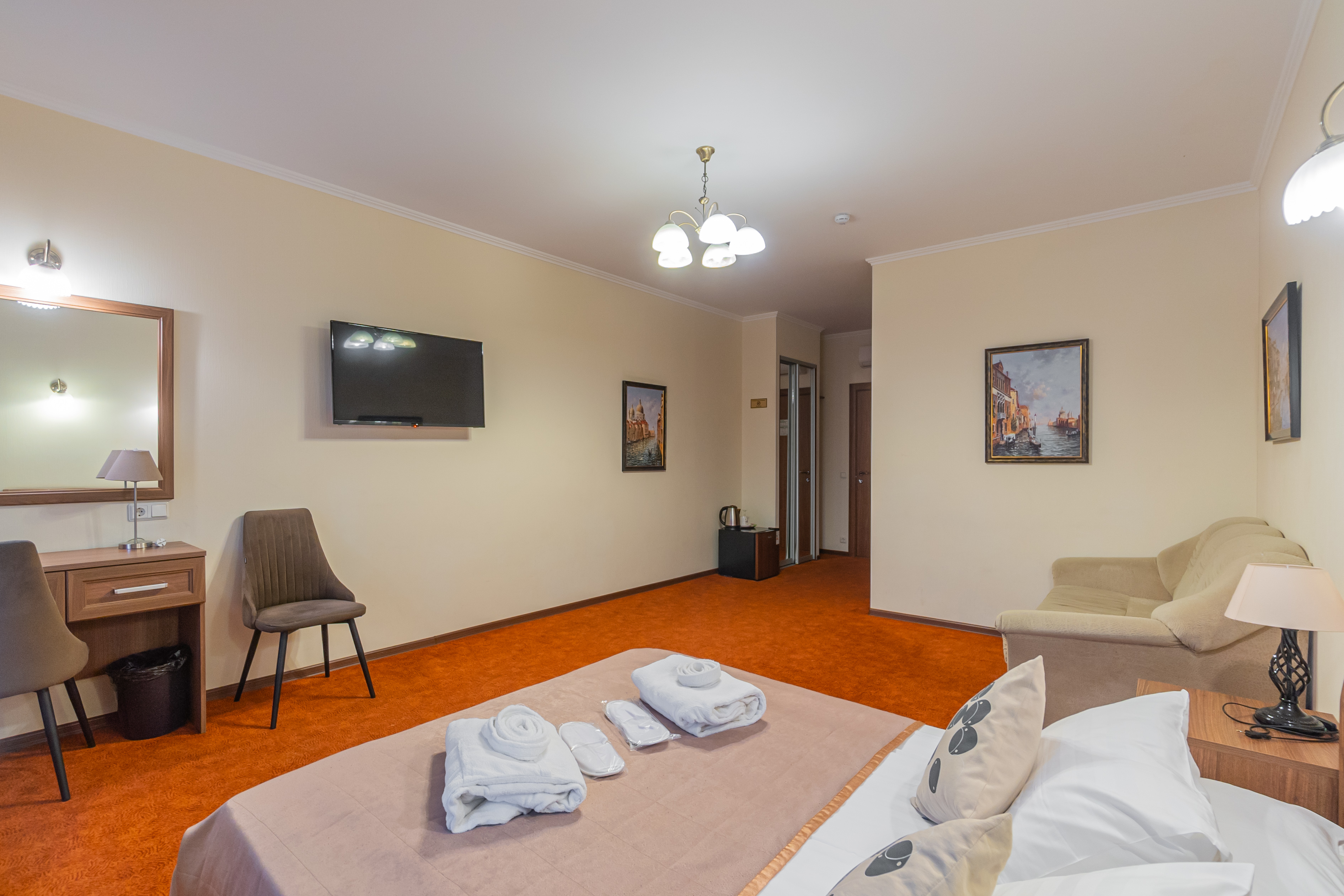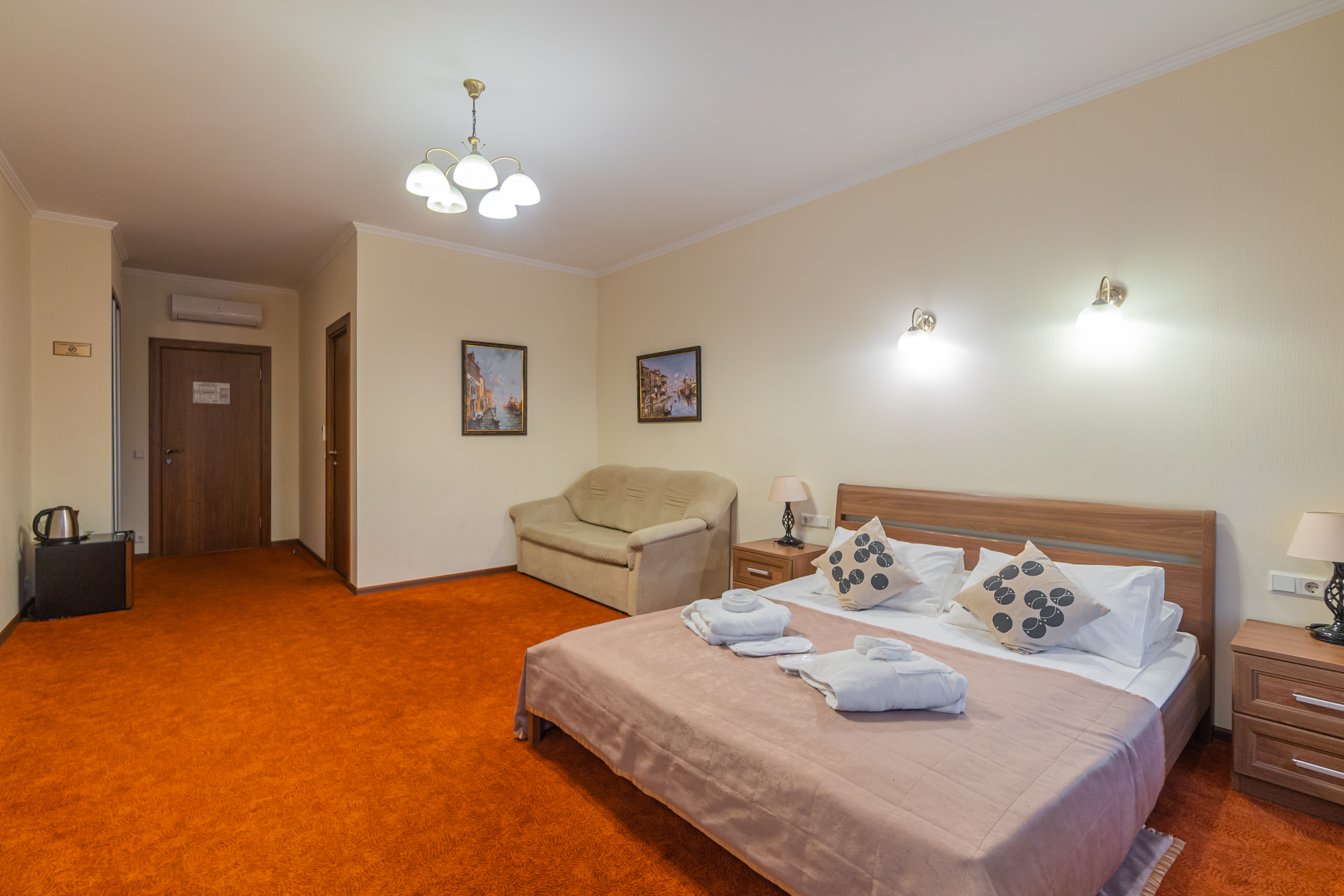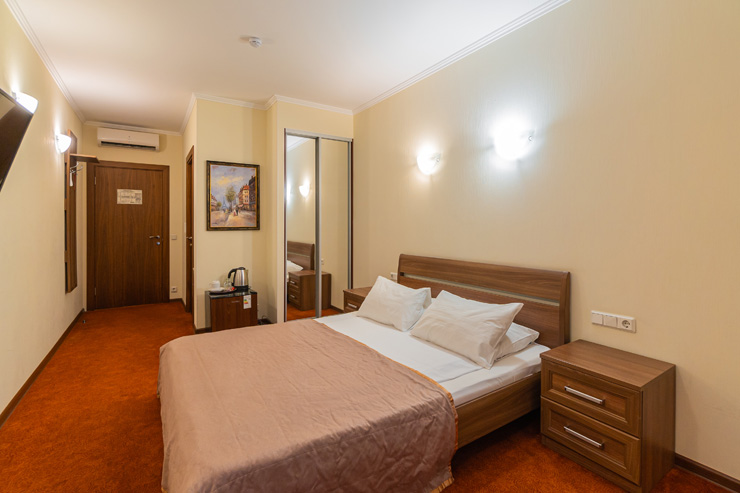 В номере: зеркало, кровать двуспальная, прикроватные тумбочки, стол, стулья, шкаф, кондиционер, мини-холодильник, телевизор, телефон, электрочайник