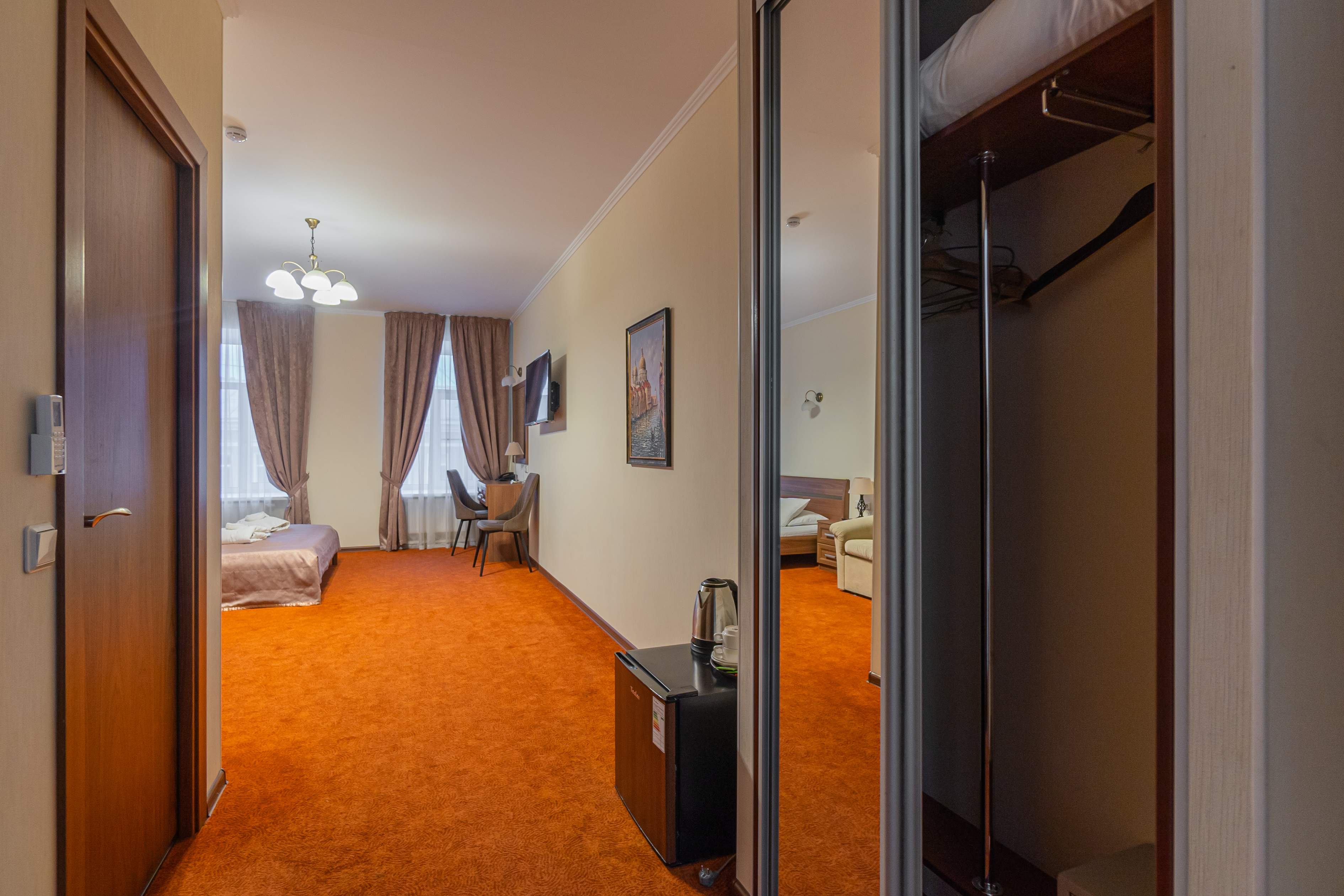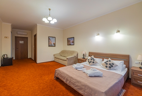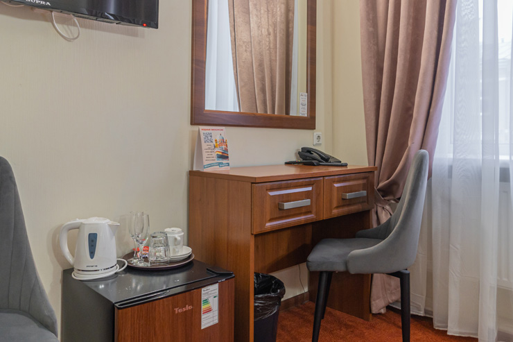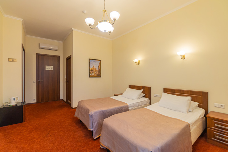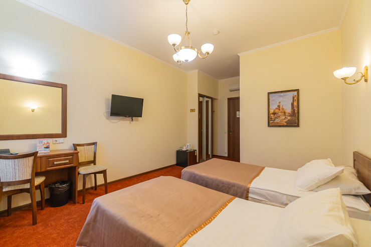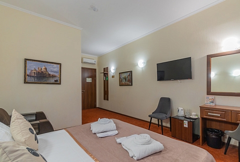 В номере: зеркало, кровати односпальные /одна двуспальная кровать, прикроватные тумбочки, стол, стулья, шкаф, кондиционер, мини-холодильник, телевизор, телефон, электрочайник