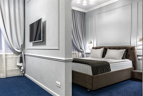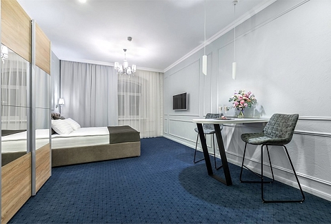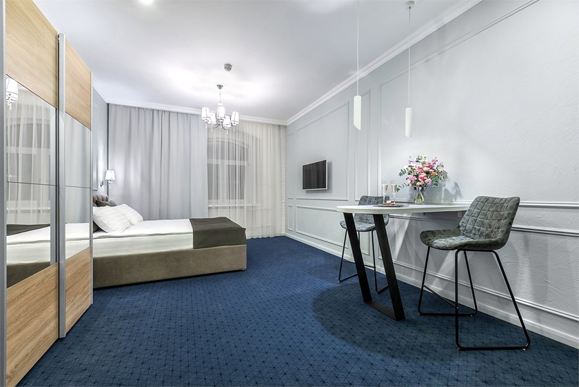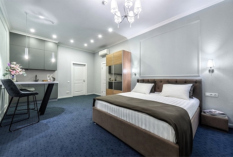 В номере: кровать двуспальная, прикроватные тумбочки, стол, стулья, шкаф, гладильная доска, мини-холодильник, набор посуды, плита электрическая, сейф, сплит-система, стиральная машина, телевизор, утюг, электрочайник
