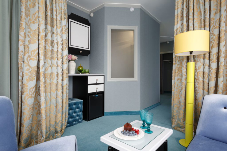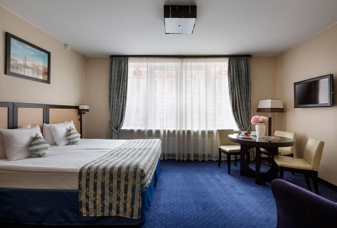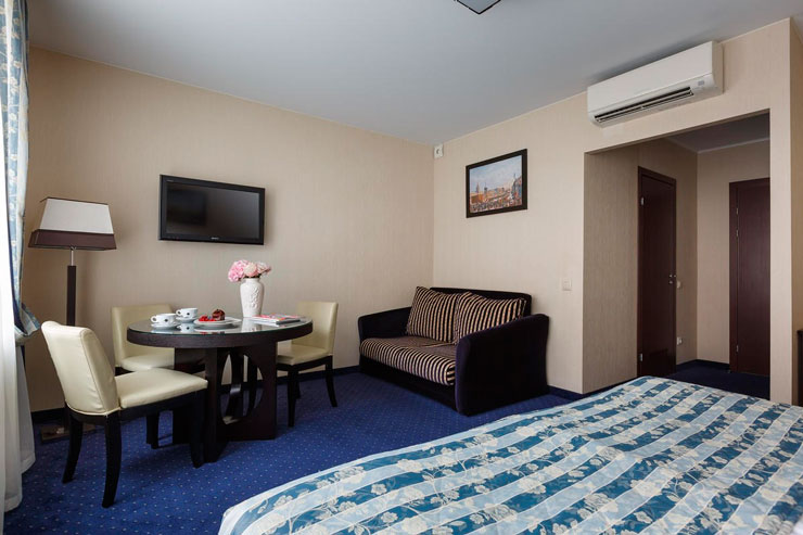 В номере: вешалка, диван раскладной, зеркало, ковровое покрытие, кровать двуспальная, прикроватные тумбочки, стол, столик журнальный, стул, тумба, шкаф, кондиционер, мини-холодильник, сейф, телевизор, телефон, чайный набор посуды