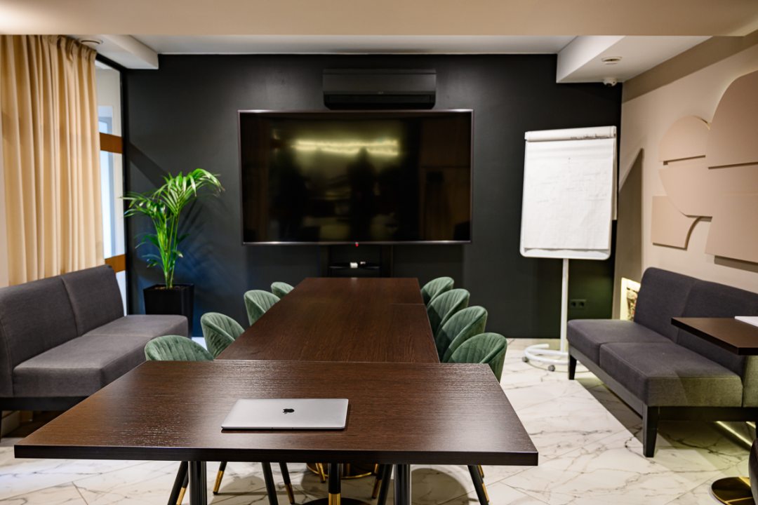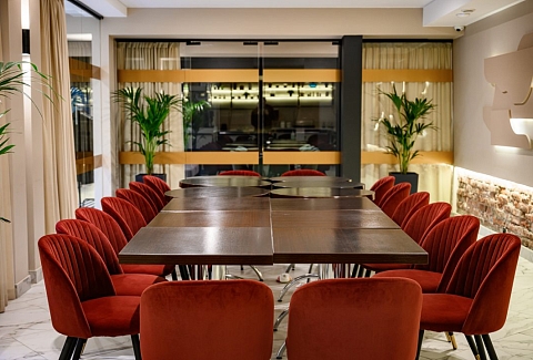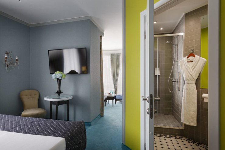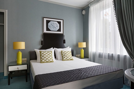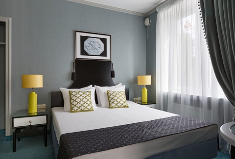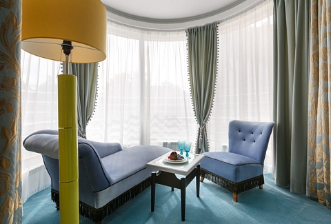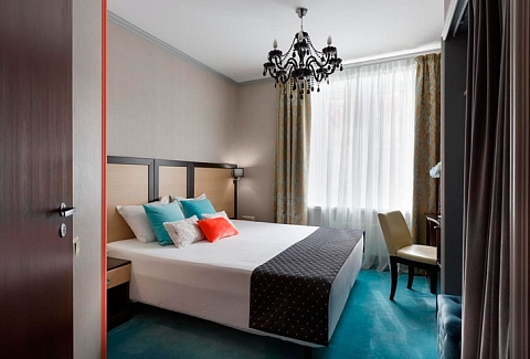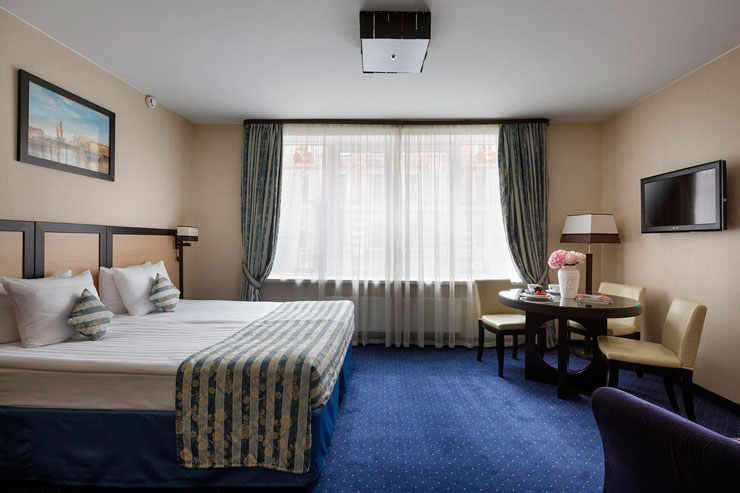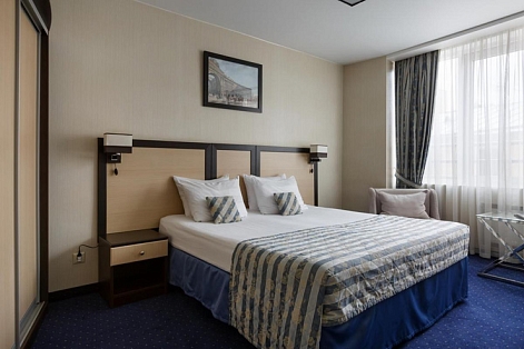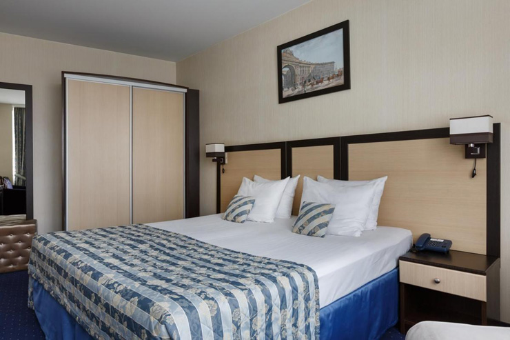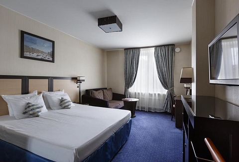 В номере: вешалка, зеркало, ковровое покрытие, кресло, кровать двуспальная, набор мягкой мебели, прикроватные тумбочки, стол, столик журнальный, стул, тумба, шкаф, кондиционер, мини-холодильник, сейф, телевизор, телефон, чайный набор посуды