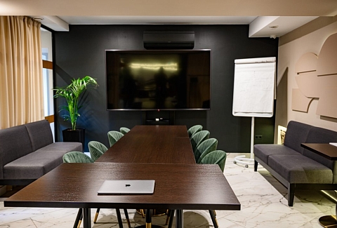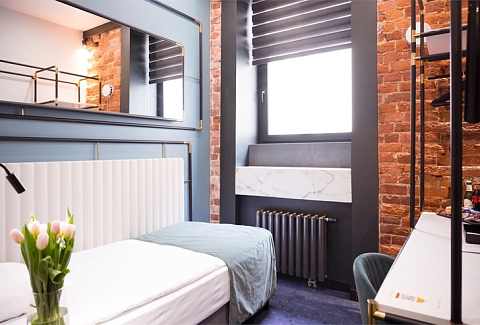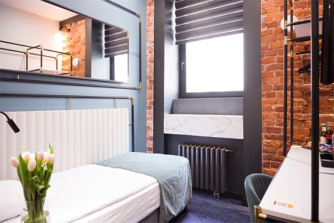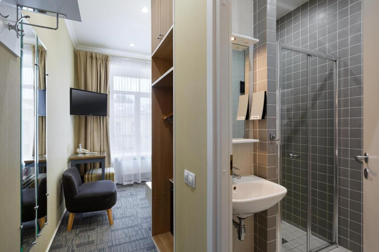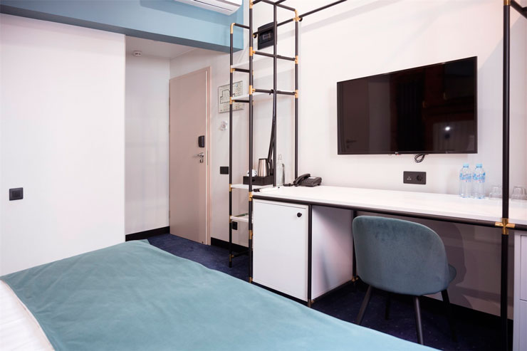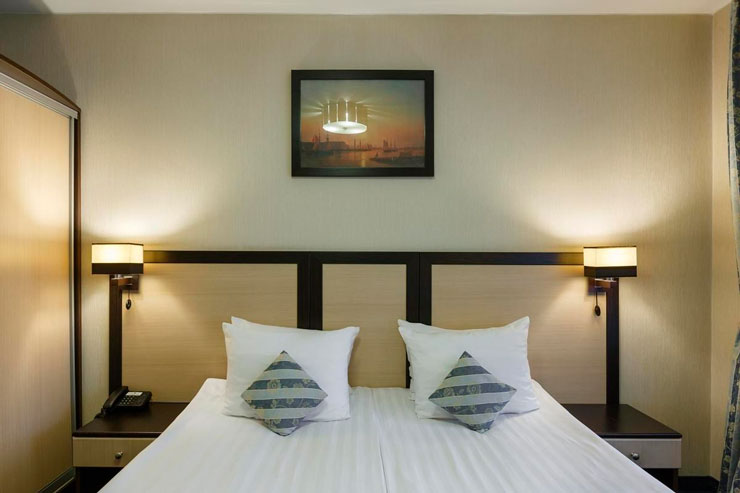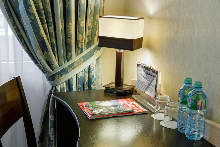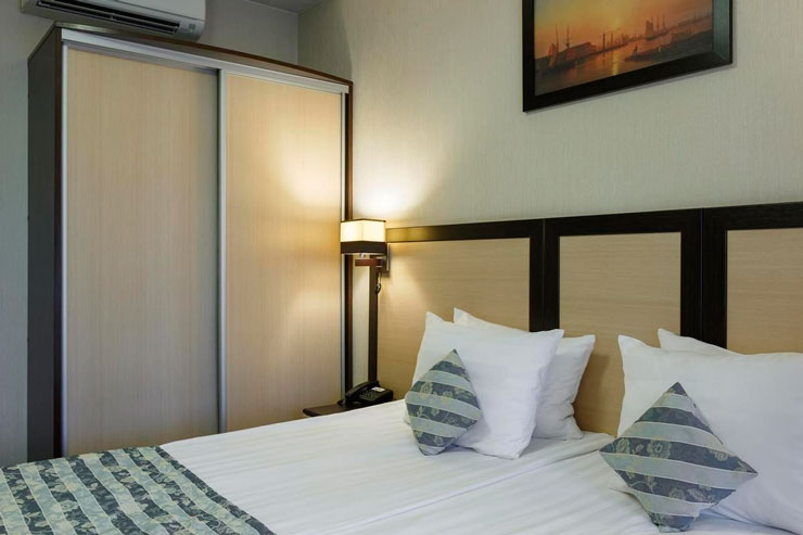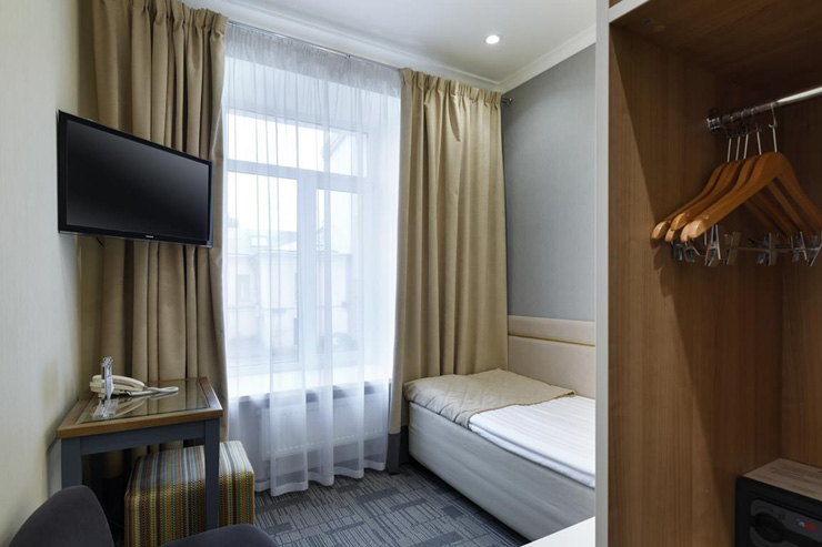 В номере: вешалка, зеркало, ковровое покрытие, кресло, кровать односпальная, стол, тумба, шкаф, гладильная доска, кондиционер, мини-холодильник, сейф, телевизор, телефон, утюг