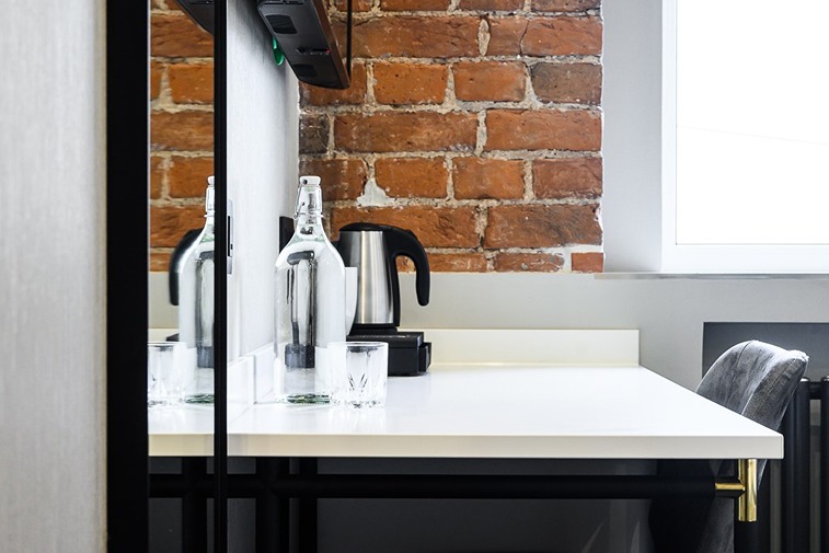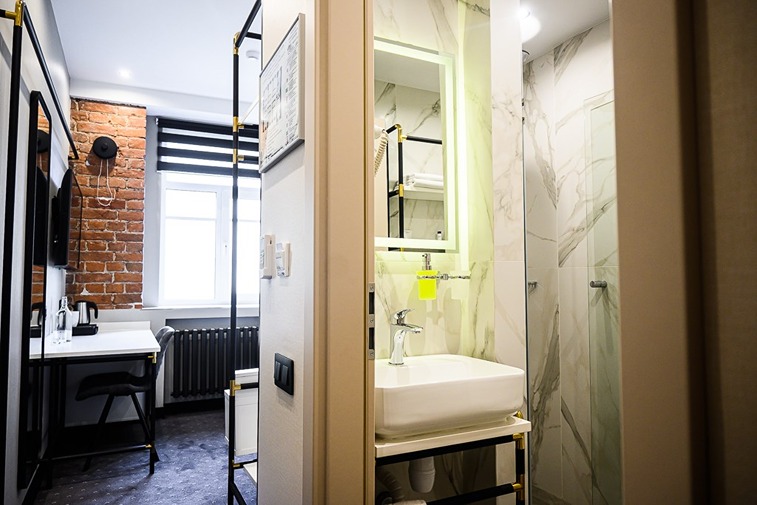 В номере: зеркало, кровать односпальная, прикроватная тумбочка, стол, стул, шкаф, мини-холодильник, телевизор, чайный набор посуды, электрочайник