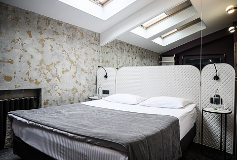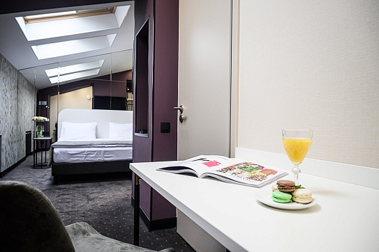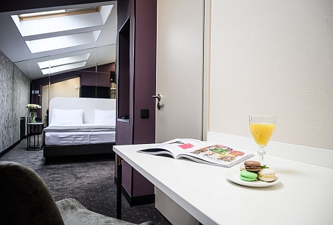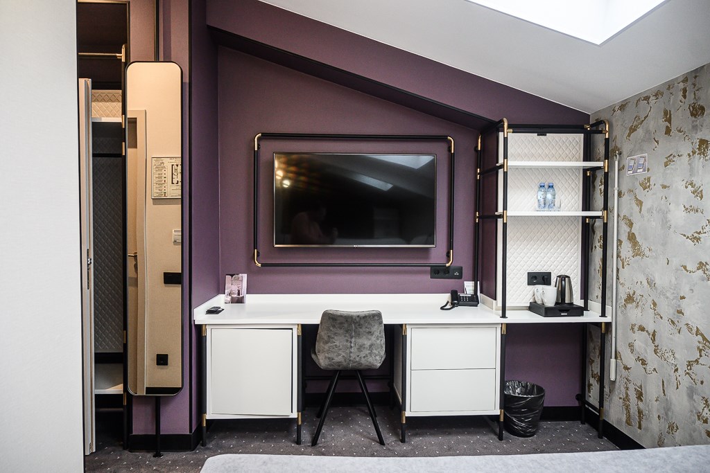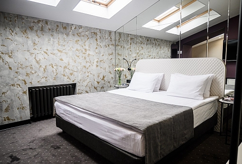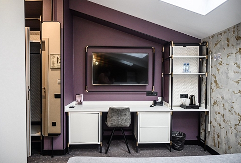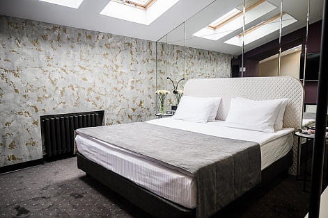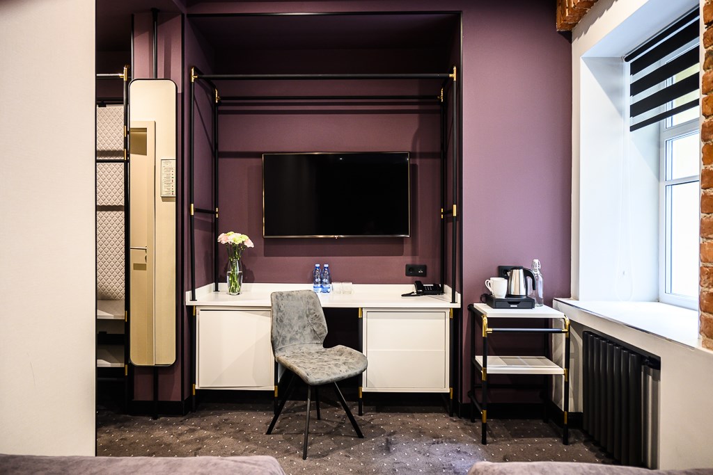 В номере: диван, зеркало, кровать двуспальная, прикроватные тумбочки, стол, стулья, шкаф, мини-холодильник, телевизор, чайный набор посуды, электрочайник