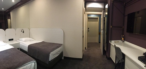В номере: зеркало, кровати односпальные, прикроватные тумбочки, стол, стулья, шкаф, мини-холодильник, телевизор, чайный набор посуды, электрочайник