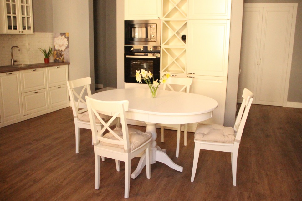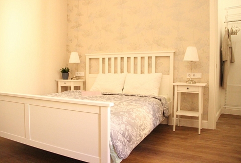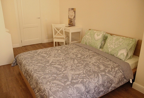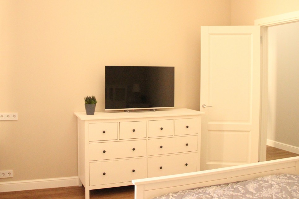 В номере: вешалка, гардеробная, диван раскладной, зеркало, комод, кровать двуспальная, стол, стулья, духовой шкаф, микроволновая печь, набор посуды, плита электрическая, посудомоечная машина, стиральная машина, телевизор, холодильник, электрочайник