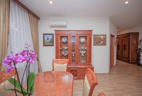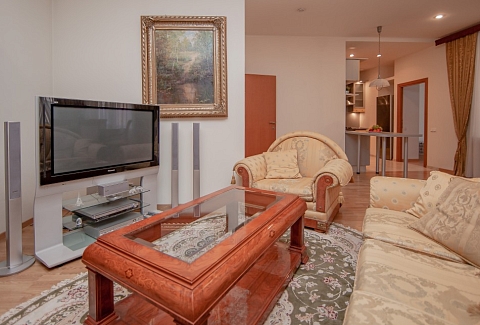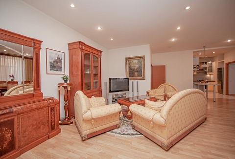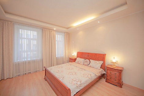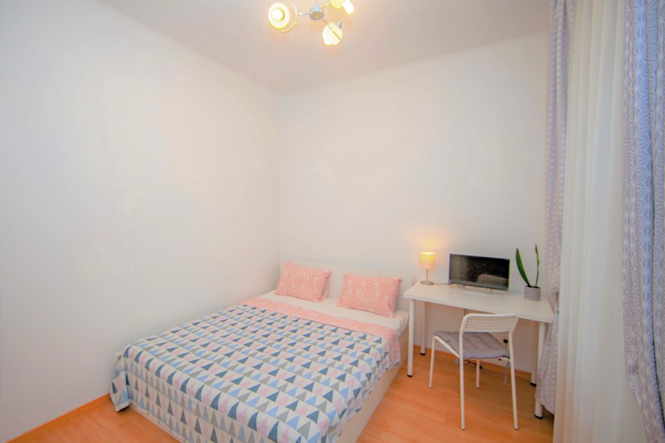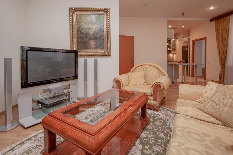 Предусмотрены 6 спальных мест: оборудованы 3 отдельные спальни, каждая укомплектована большой кроватью. В кухне-гостиной имеется уютная зона отдыха с мягкой мебелью, предусмотрено все, что может понадобиться при приготовлении блюд. Обустроены 2 санузла, в одном установлены ванна и душевая кабина. Оснащена изолированная кладовая со стиральной машиной. Гостям доступно подключение к Wi-Fi.