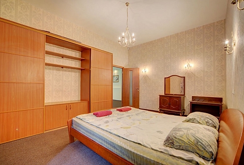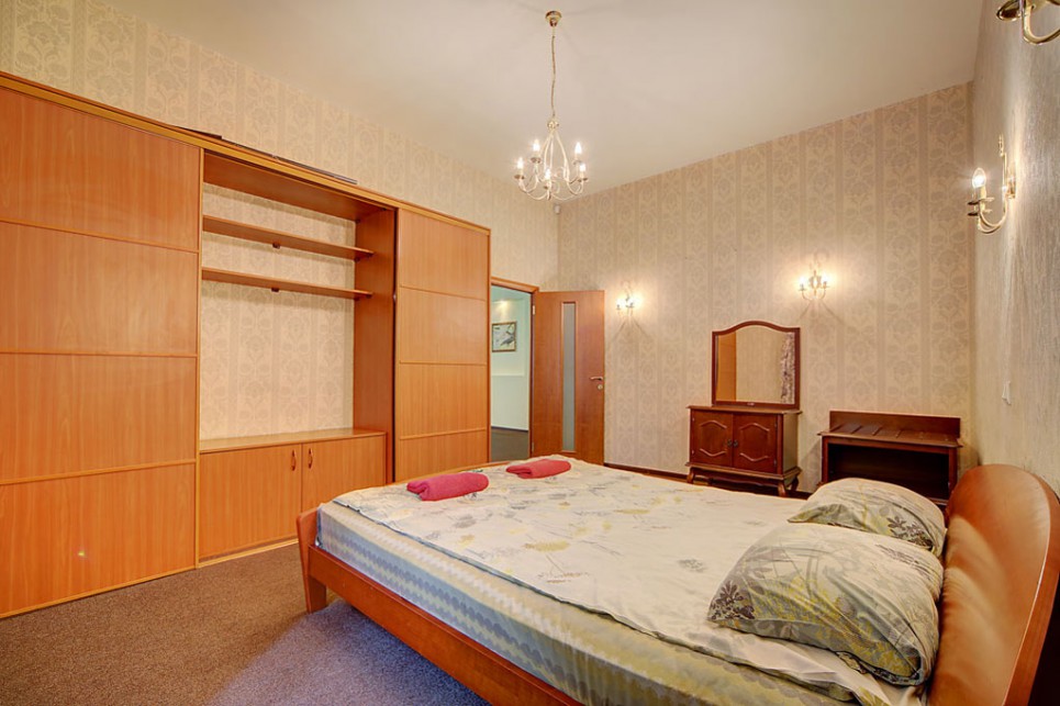 Просторные трехкомнатные апартаменты, расположенные в самом центре Санкт-Петербурга, всего в пяти минутах пешком от Невского проспекта и метро на Площади Восстания. Внутри две спальни, гостиная, кухня, а также отдельные ванная комната и туалет. В одной спальне расположена двуспальная кровать, стеллаж и журнальный столик.