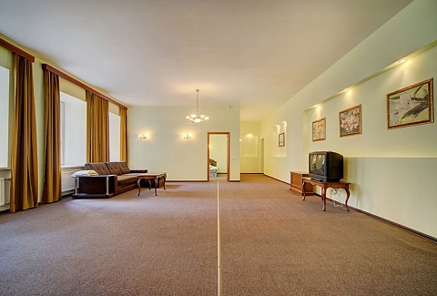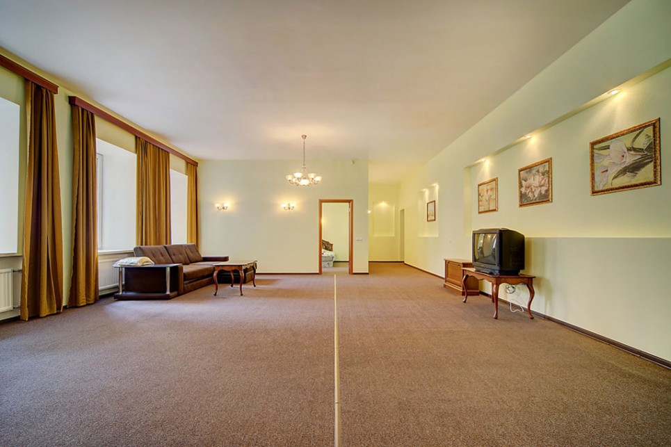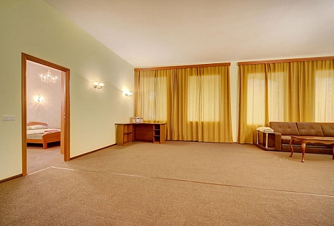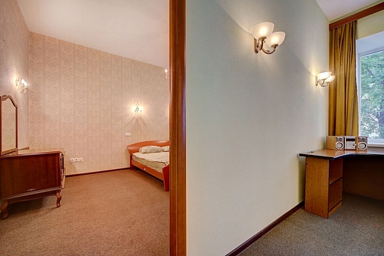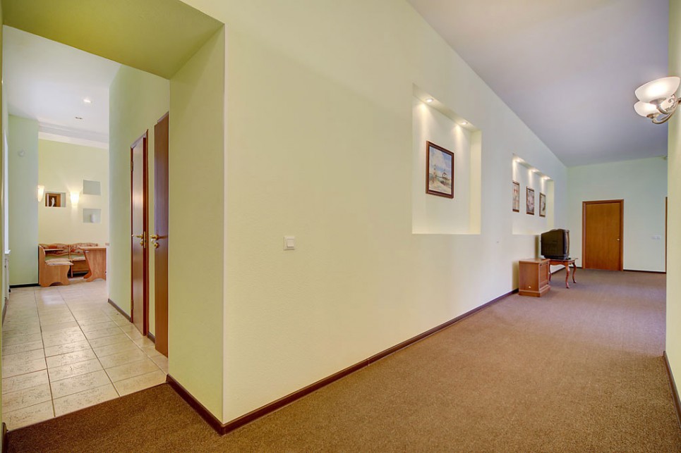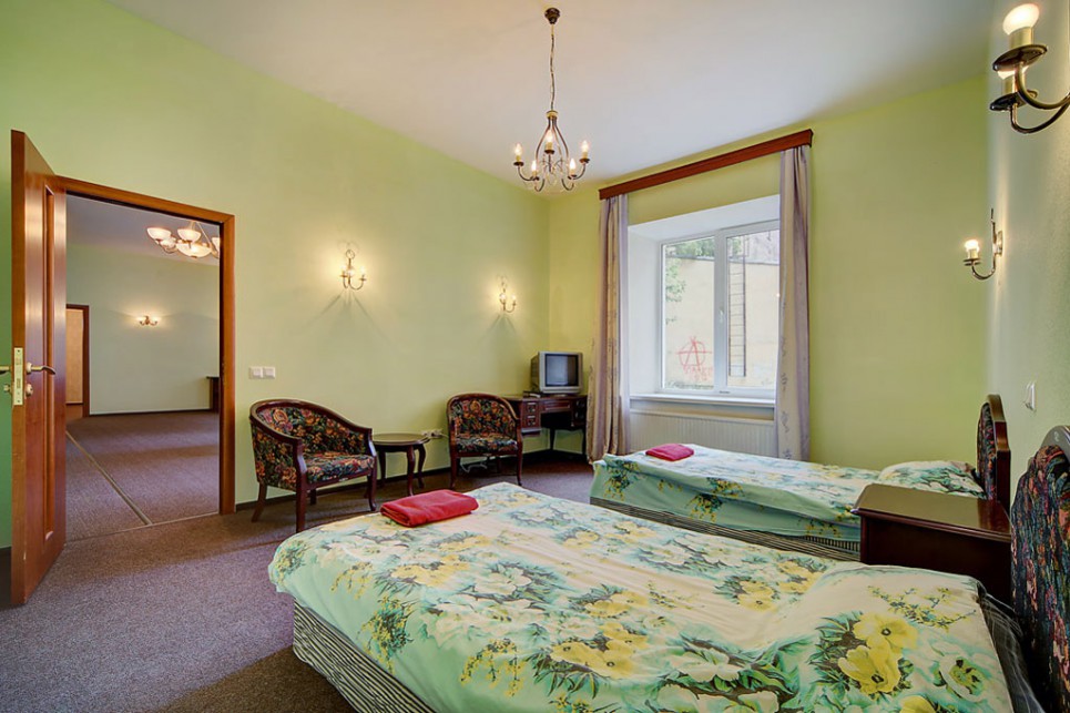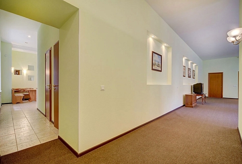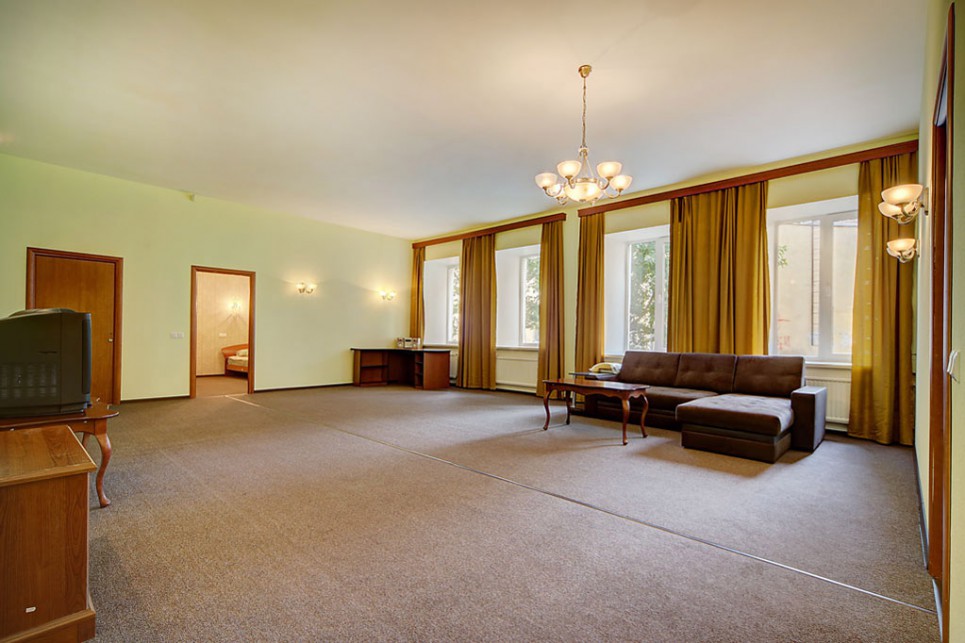 В другой спальне есть две отдельные кровати, стол, мебельный набор, телевизор и два кресла. Гостиная отличается просторностью и светом, в ней размещены большой мягкий диван, письменный стол и телевизор.Кухонная зона укомплектована гарнитуром, газовой плитой, электрическим чайником, микроволновкой, холодильником и обеденным столом с мягким уголком. Также имеется стиральная машина, вытяжка и необходимая посуда.В апартаментах находятся два санузла: туалет и ванная (с раковиной, душевой кабиной и феном). Вход в здание осуществляется со двора.