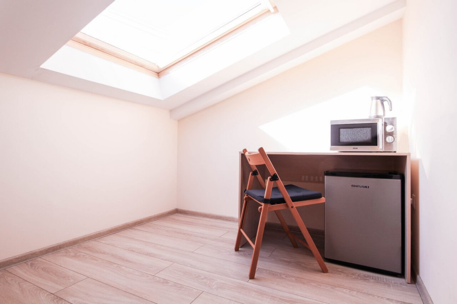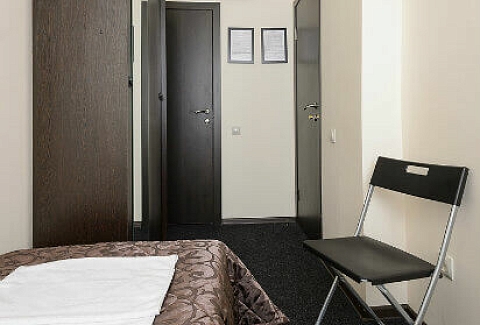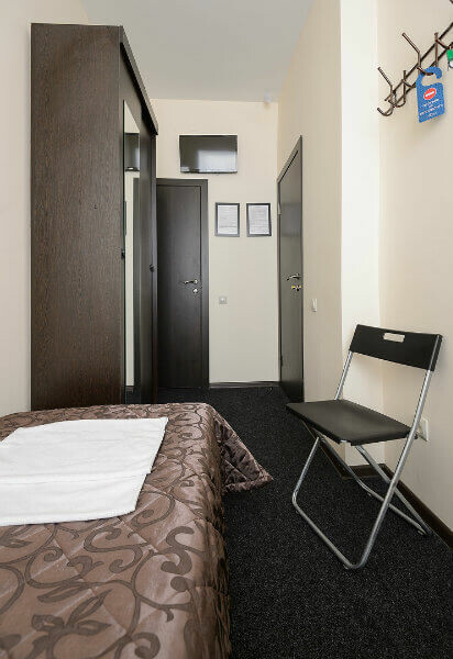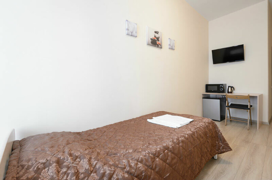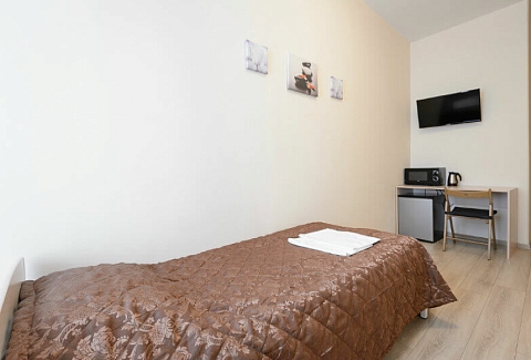 В номере: зеркало, кровать односпальная, прикроватная тумбочка, стол, стул, шкаф, микроволновая печь, мини-холодильник, телевизор ЖК, электрочайник