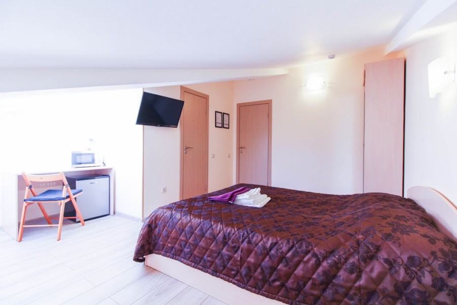 В номере: зеркало, кровать двуспальная, прикроватные тумбочки, стол, стулья, шкаф, микроволновая печь, мини-холодильник, телевизор ЖК, электрочайник