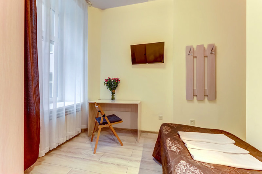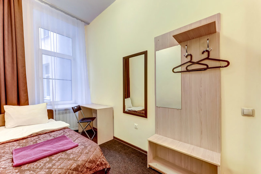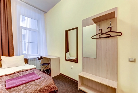 В номере: вешалка, зеркало, кровать односпальная, стол, стул, телевизор