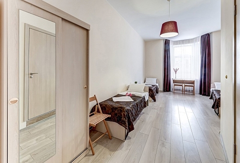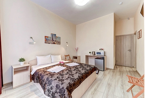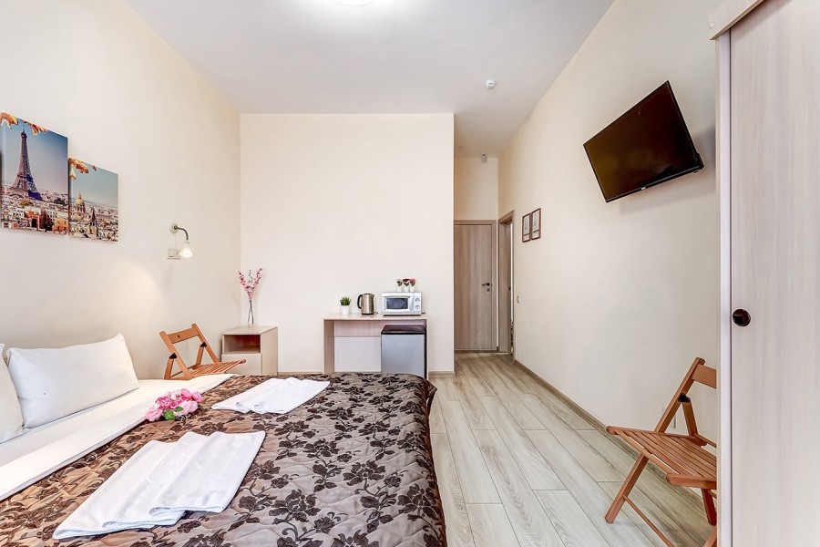 В номере: вешалка, зеркало, кровати односпальные /одна двуспальная кровать, стол, стулья, микроволновая печь, мини-холодильник, телевизор, электрочайник
