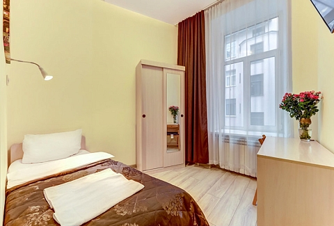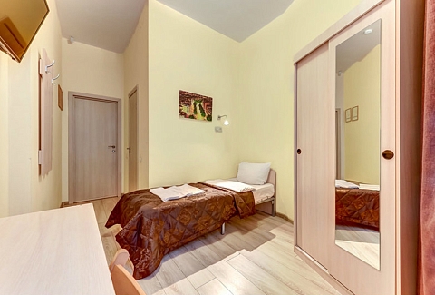 В номере: вешалка, зеркало, кровать односпальная, стол, стул, шкаф, микроволновая печь, мини-холодильник, телевизор, электрочайник