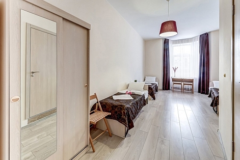 В номере: вешалка, зеркало, кровати односпальные /одна двуспальная кровать, стол, стулья, телевизор