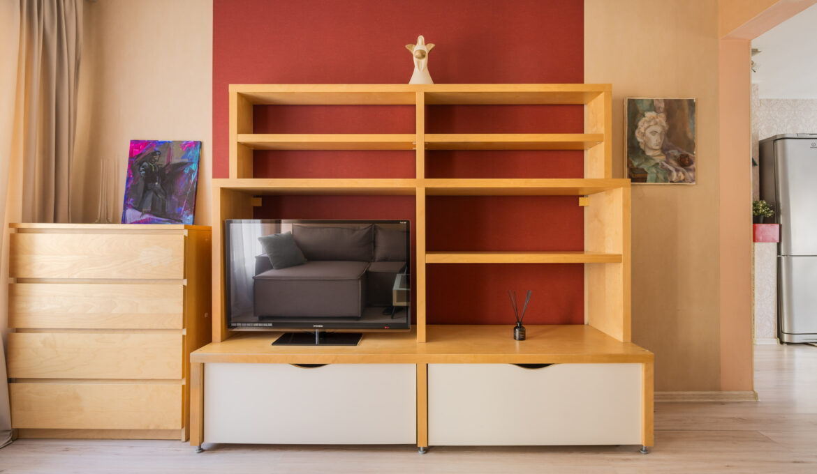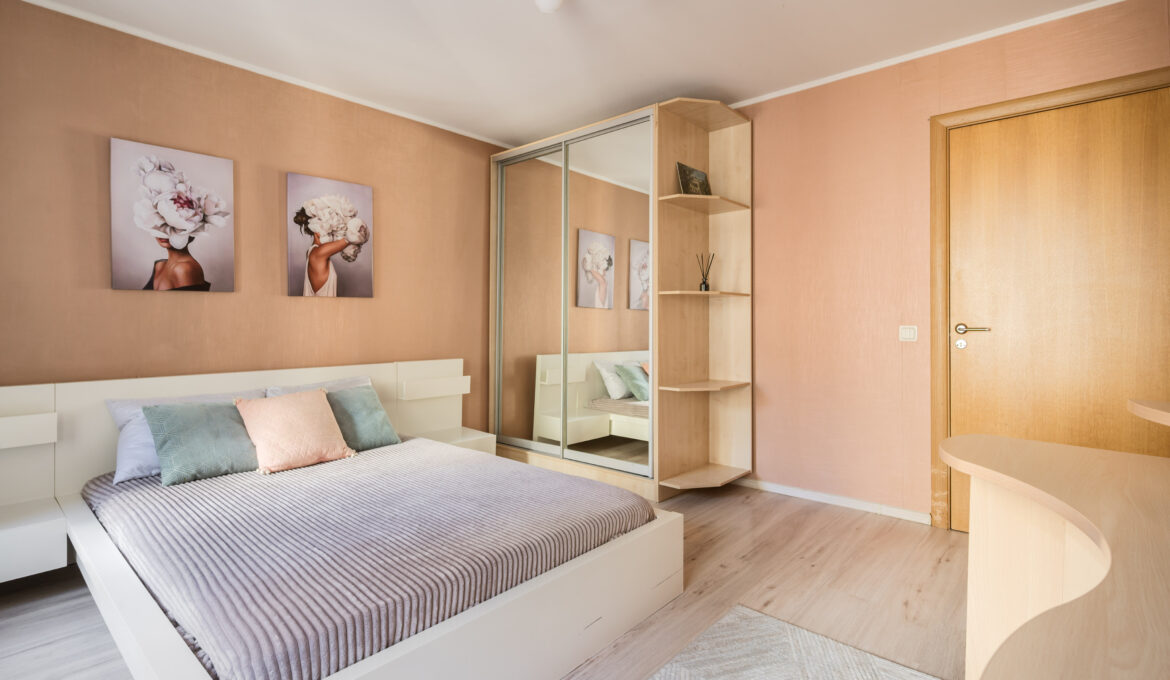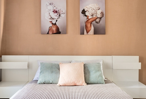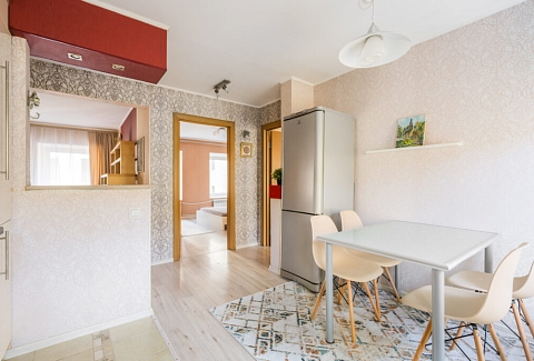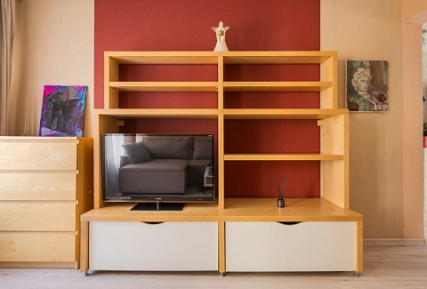 В номере: вешалка, диван раскладной, зеркало, кровать двуспальная, прикроватные тумбочки, стеллаж, стол обеденный, стулья, тумба под телевизор, шкаф, гладильная доска, кондиционер, микроволновая печь, набор посуды, плита, стиральная машина, сушилка для белья, телевизор ЖК, утюг, холодильник, электрочайник