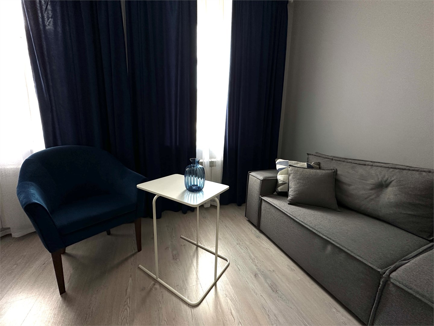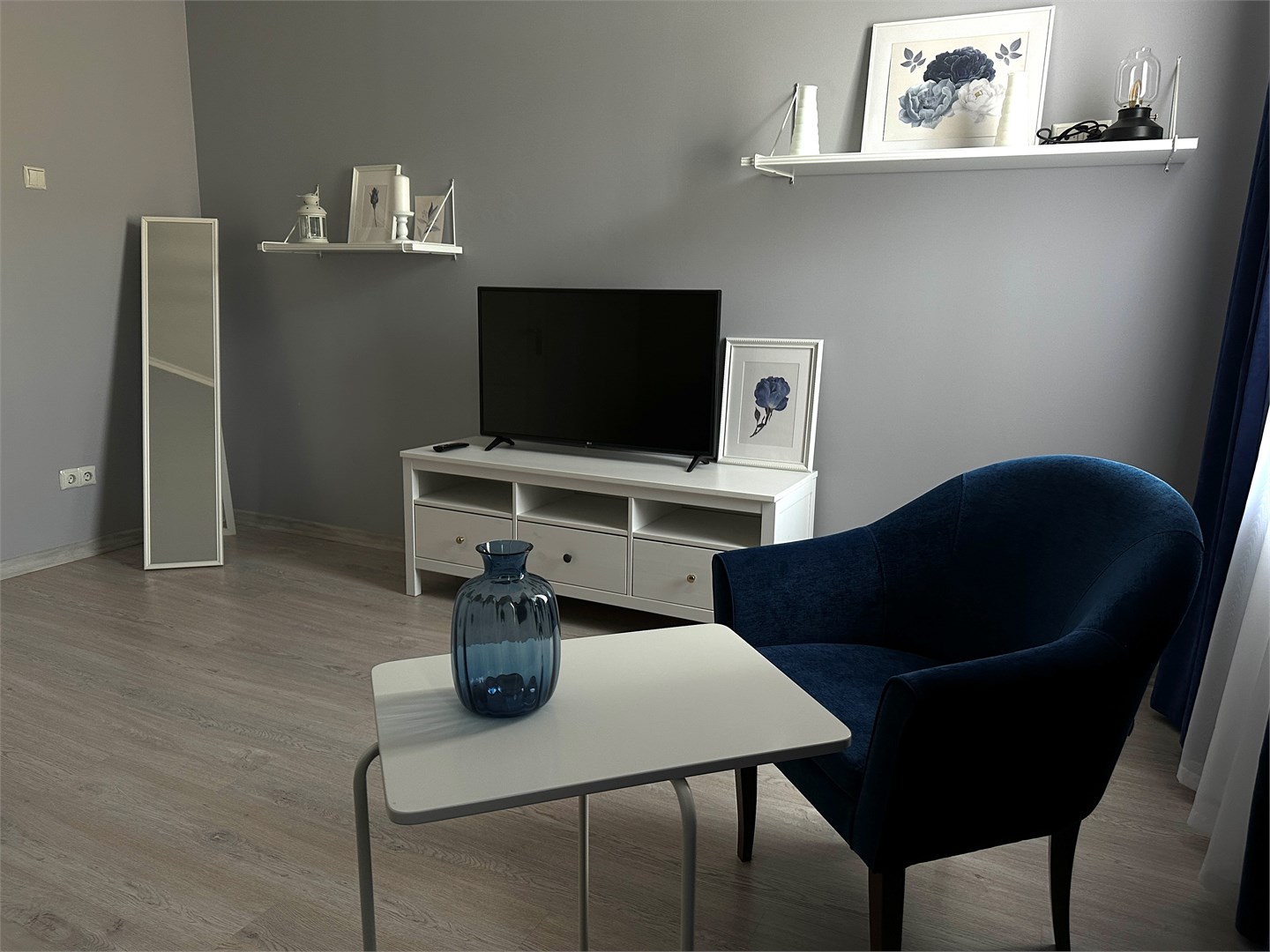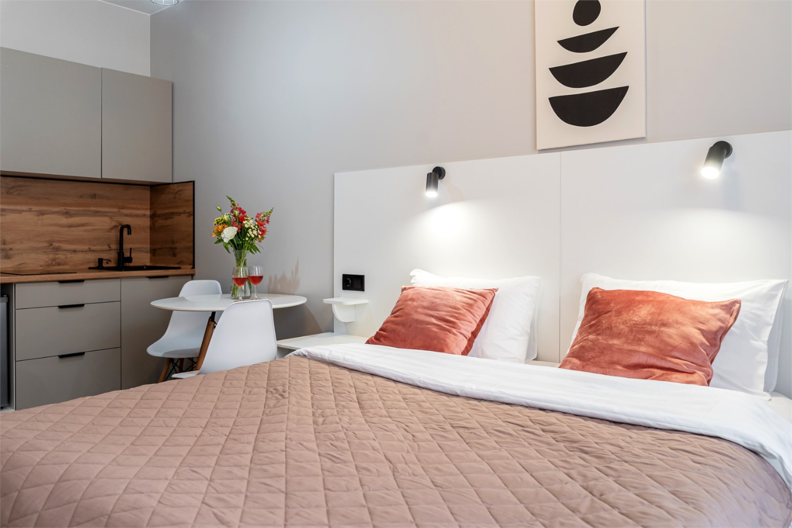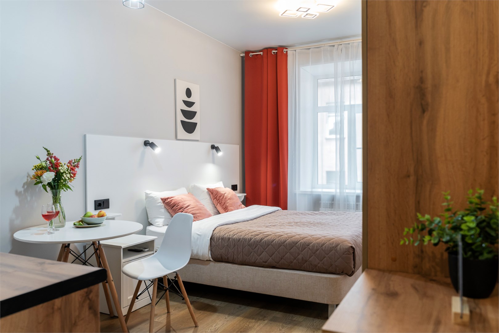 В номере: вешалка, зеркало, кровать двуспальная, кухонная мебель, прикроватные тумбочки, стол обеденный, стулья, шкаф, микроволновая печь, мини-холодильник, набор посуды, плита электрическая, телевизор ЖК, телефон, чайный набор посуды, электрочайник
