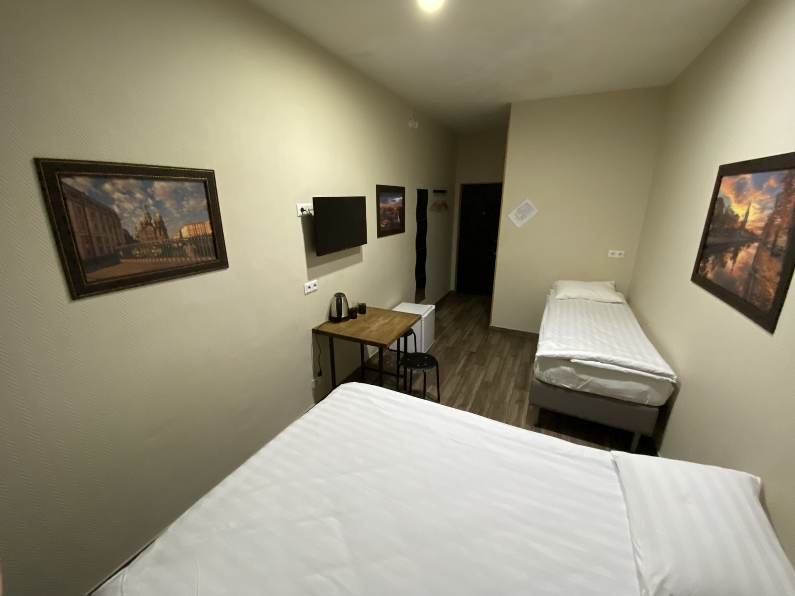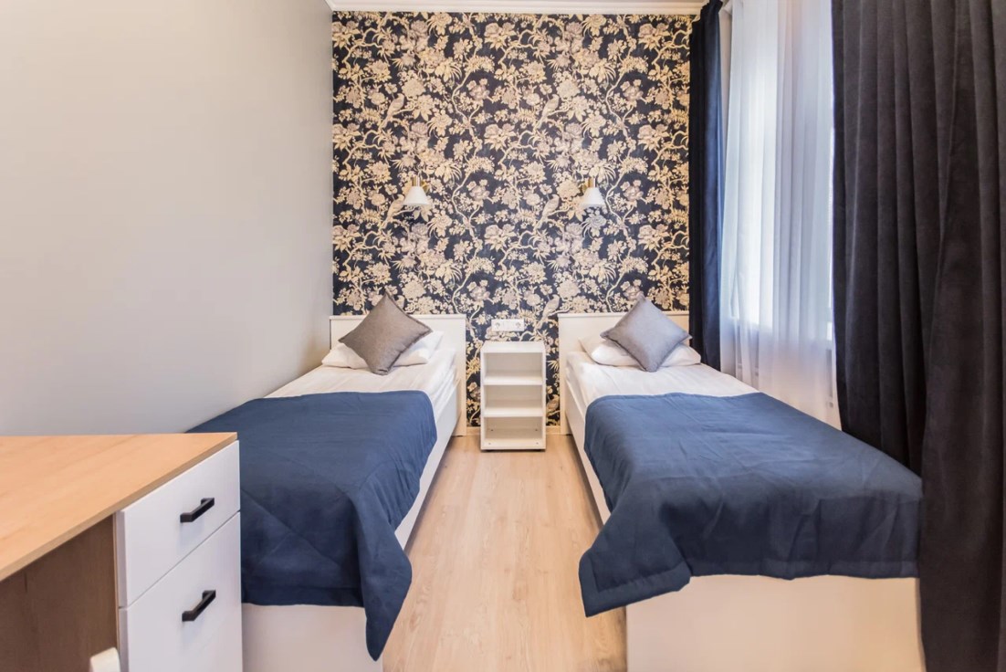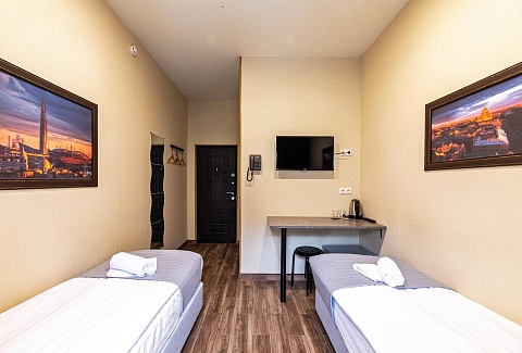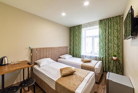 В номере: вешалка, зеркало, кровати односпальные, стол, стулья, мини-холодильник, телевизор, телефон, электрочайник