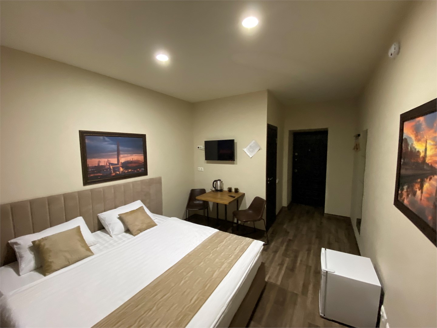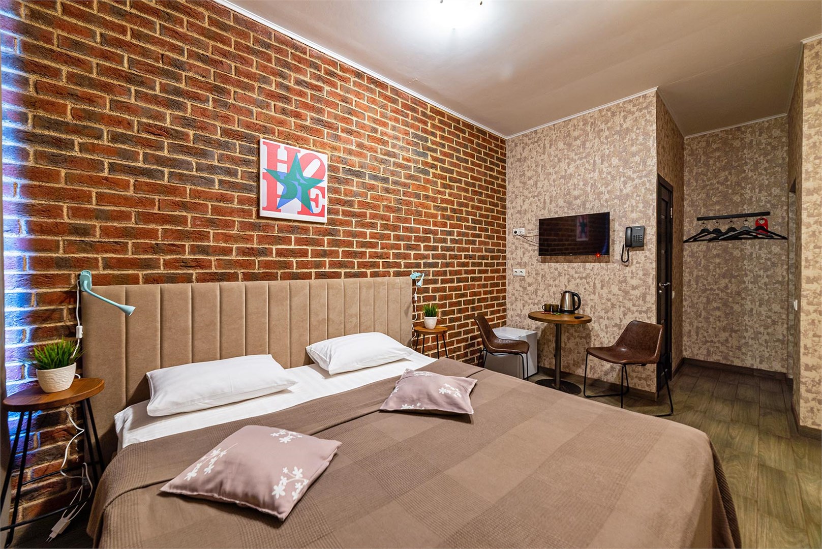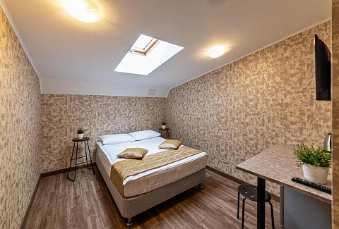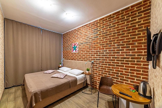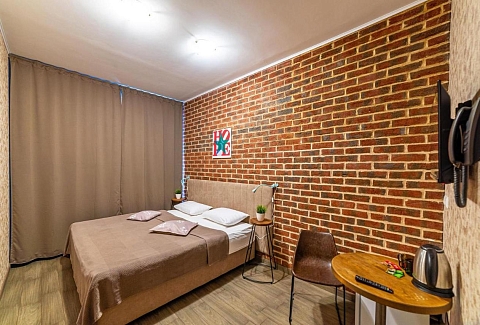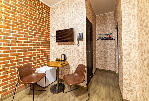 В номере: вешалка, зеркало, кровать двуспальная, стол, стулья, мини-холодильник, телевизор, телефон, электрочайник