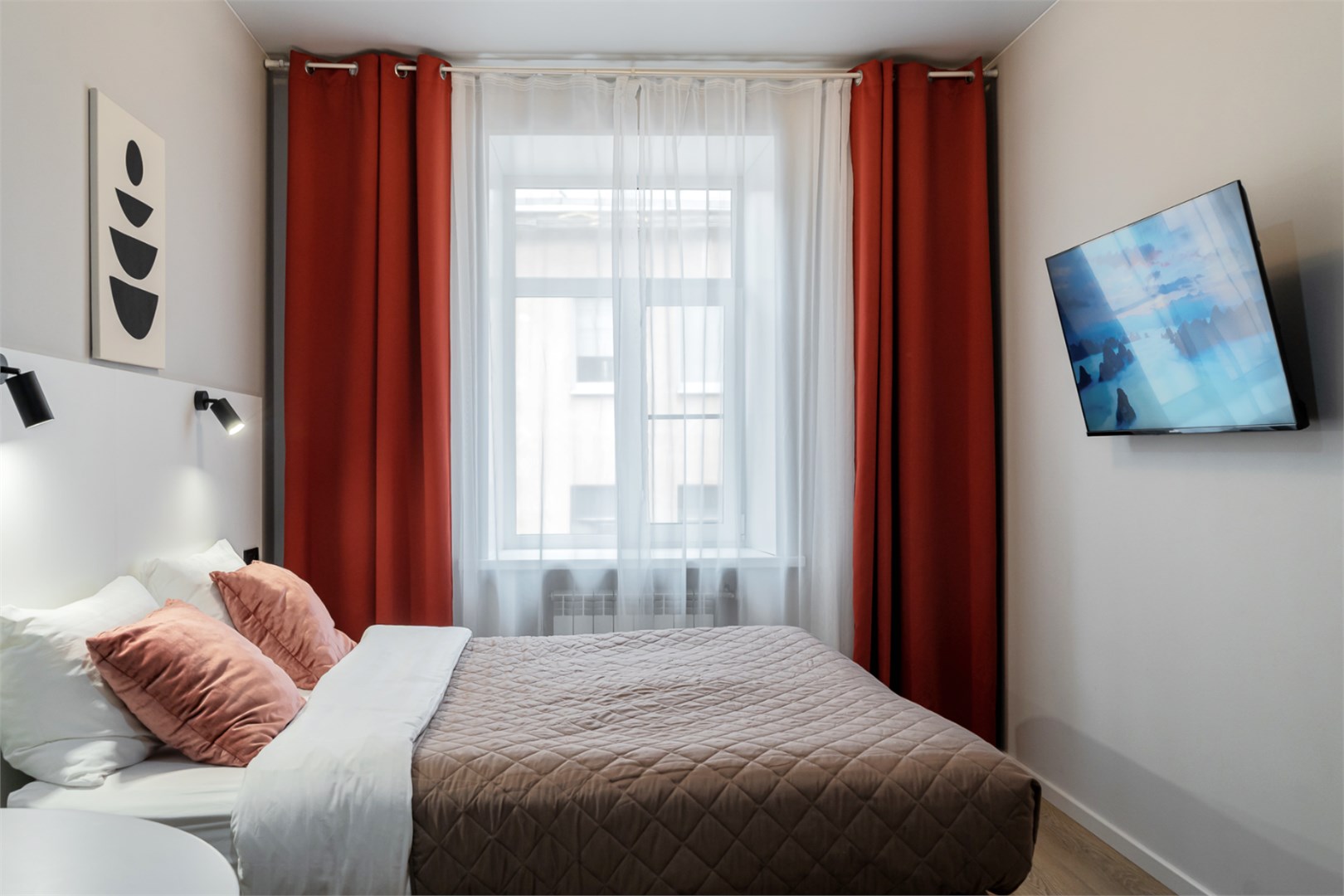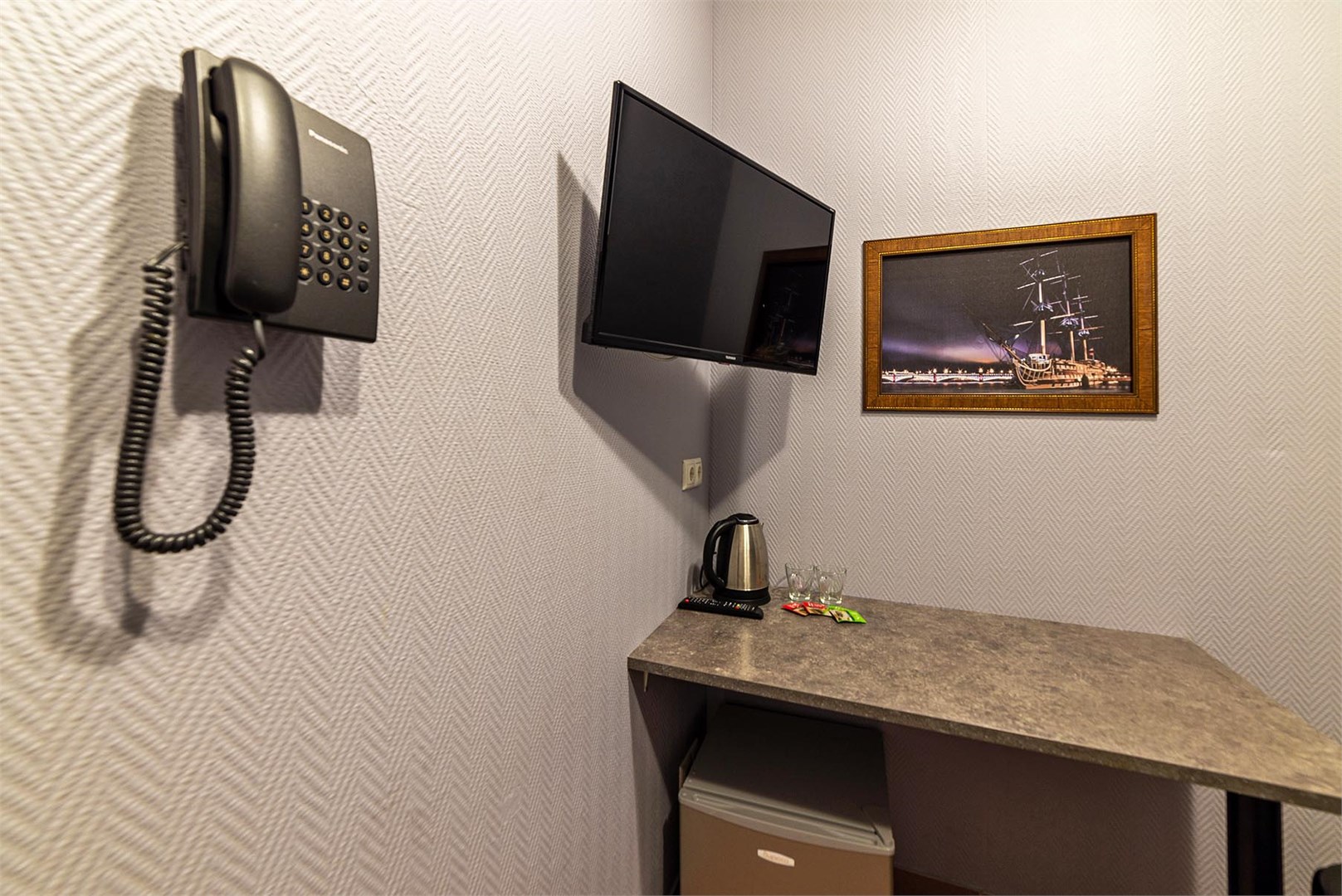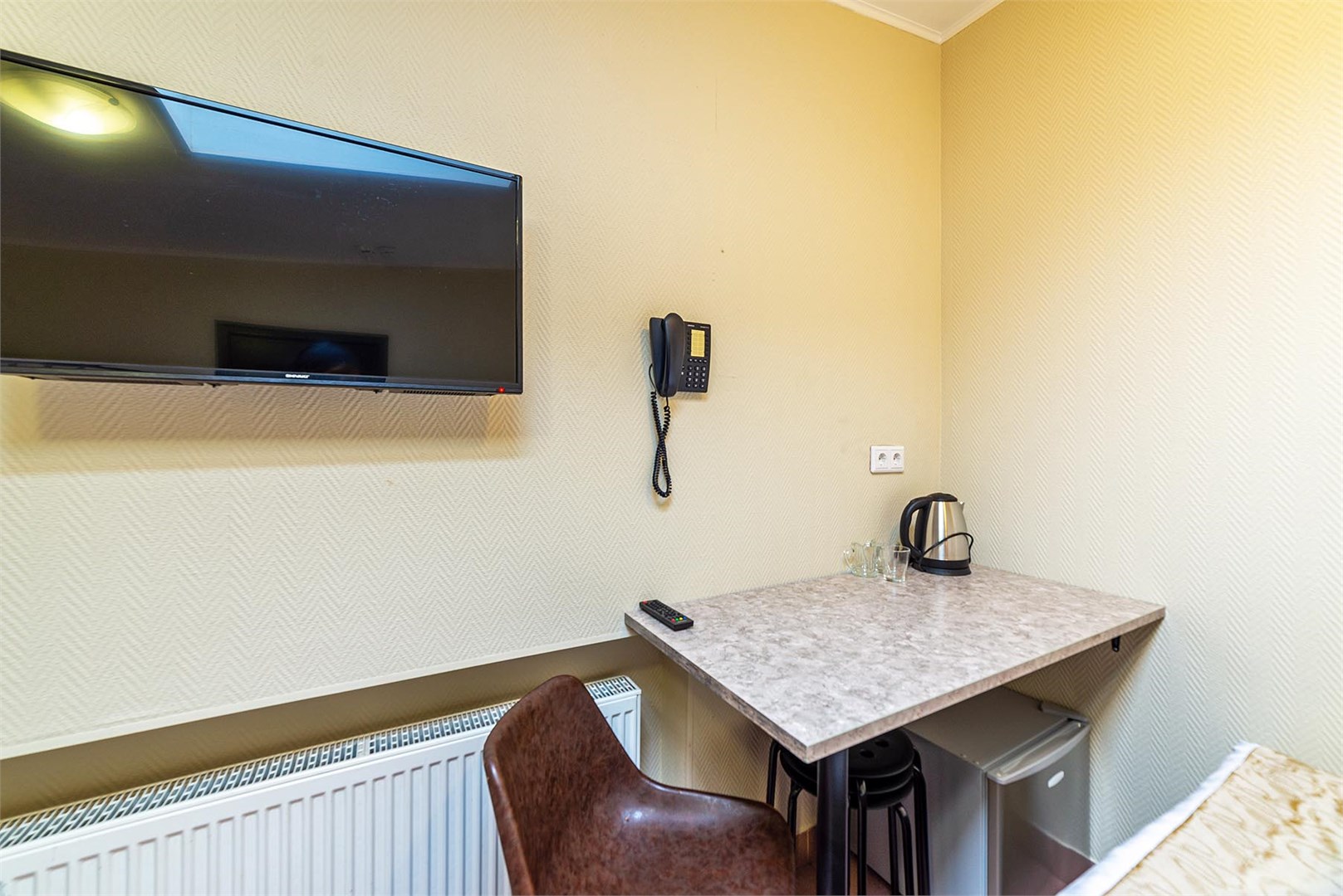 В номере: вешалка, зеркало, кровать двуспальная, стол, стулья, мини-холодильник, телевизор, телефон, электрочайник