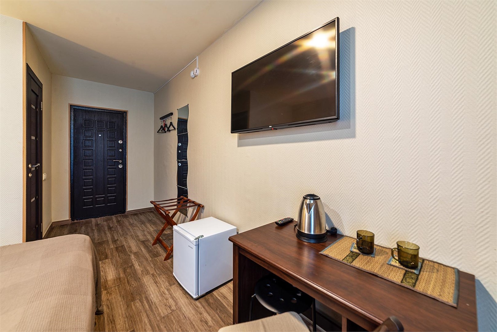 В номере: вешалка, зеркало, кровати односпальные, стол, стулья, вентилятор, телевизор ЖК, холодильник