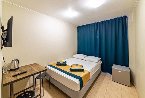 В номере: вешалка, зеркало, кровать полутороспальная, стол, стул, вентилятор, телевизор ЖК, телефон, холодильник, чайный набор посуды, электрочайник