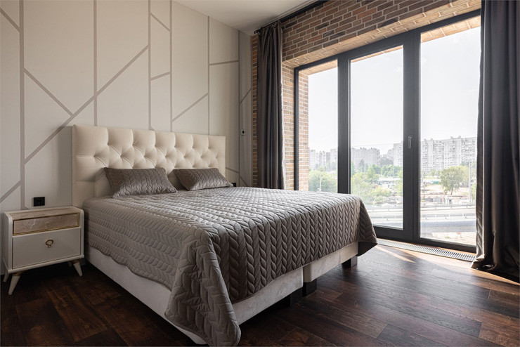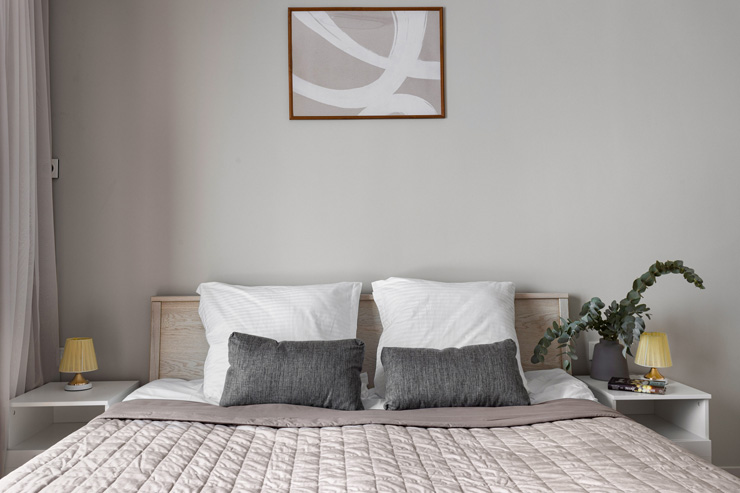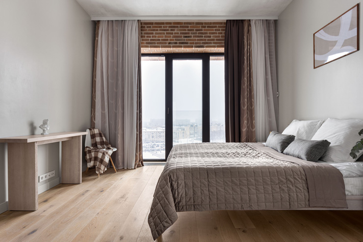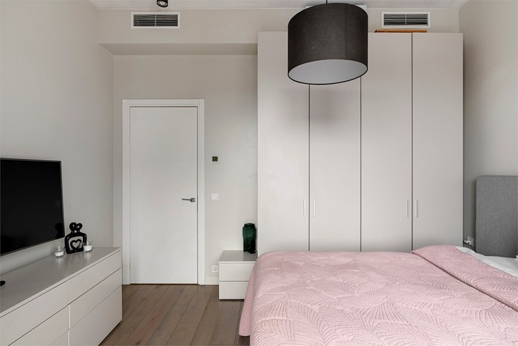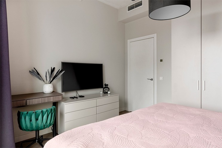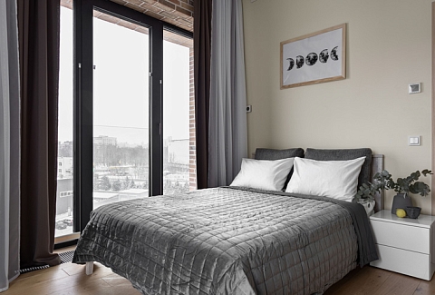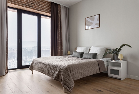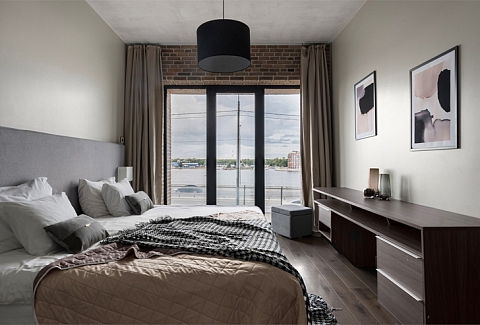 В номере: вешалка, гардеробная, диван раскладной, зеркало, кровать двуспальная, прикроватные тумбочки, стол, стулья, шкаф, гладильная доска, кондиционер, микроволновая печь, набор посуды, плита электрическая, посудомоечная машина, сплит-система, стиральная машина, телевизор, утюг, холодильник, электрочайник