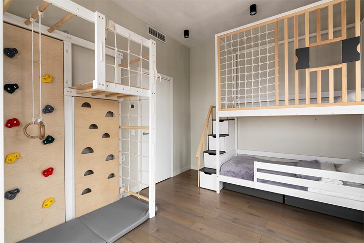 В номере: вешалка, диван раскладной, зеркало, кровать двуспальная, кровать двухъярусная, прикроватные тумбочки, стол, стулья, шкаф, гладильная доска, духовой шкаф, кондиционер, кофемашина, микроволновая печь, набор посуды, плита электрическая, посудомоечная машина, стиральная машина, телевизор, утюг, холодильник, электрочайник
