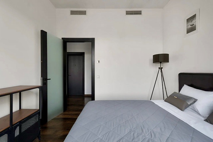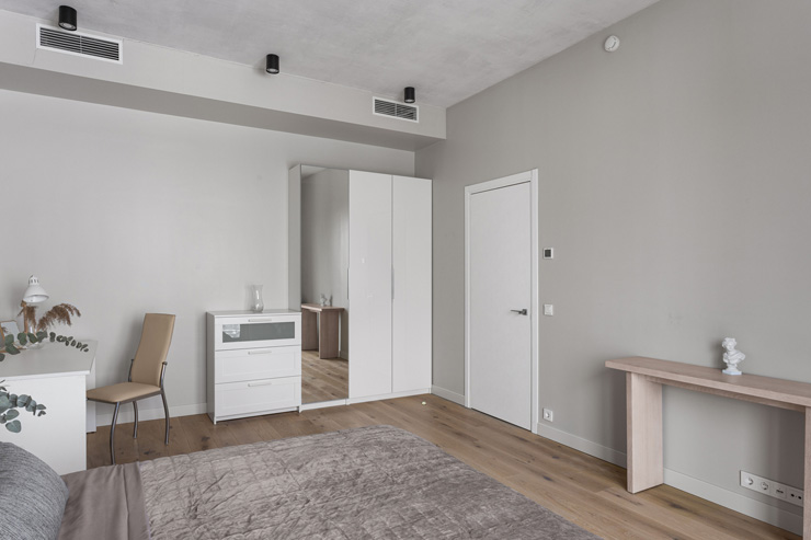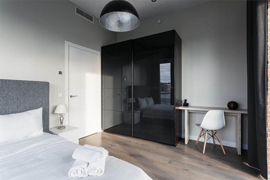 В номере: вешалка, гардеробная, диван раскладной, зеркало, кровать двуспальная, прикроватные тумбочки, стол, стулья, шкаф, гладильная доска, духовой шкаф, кондиционер, кофемашина, микроволновая печь, набор посуды, плита электрическая, посудомоечная машина, стиральная машина, телевизор, утюг, холодильник, электрочайник