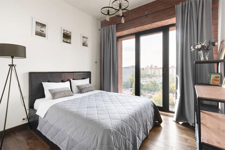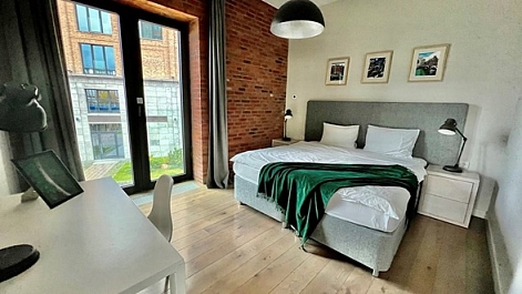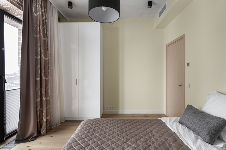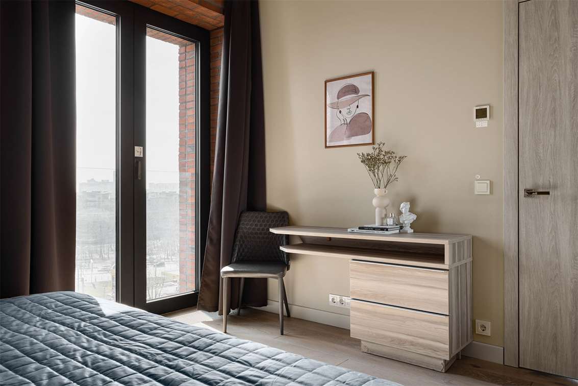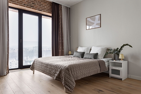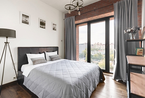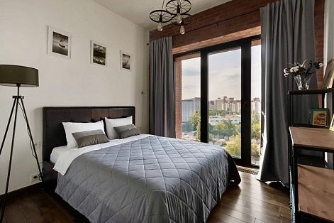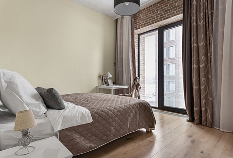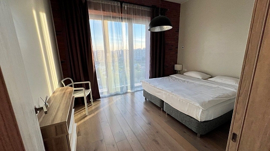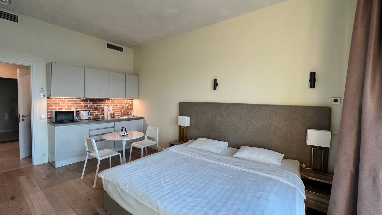 В номере: вешалка, диван, зеркало, комод, кровать двуспальная, прикроватные тумбочки, стол, стулья, шкаф, гладильная доска, духовой шкаф, кондиционер, кофемашина, микроволновая печь, набор посуды, плита электрическая, стиральная машина, сушилка для белья, телевизор, утюг, холодильник, электрочайник