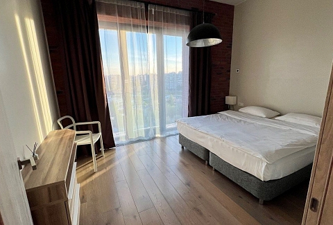 В номере: вешалка, гардеробная, зеркало, кровать двуспальная, стол, стулья, шкаф, гладильная доска, кондиционер, микроволновая печь, набор посуды, плита электрическая, стиральная машина, телевизор, утюг, холодильник, электрочайник