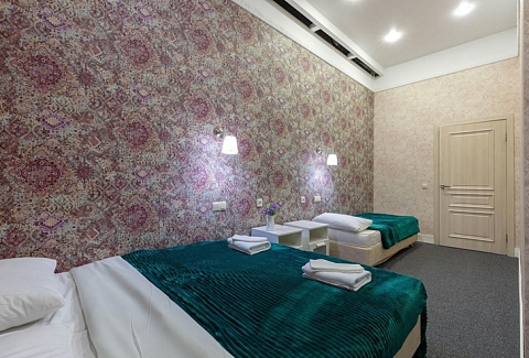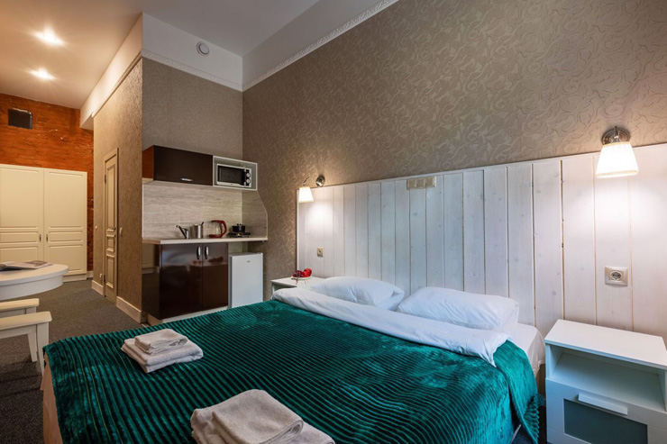 В номере: диван раскладной, кровать двуспальная, кровать односпальная, стол, стулья, шкаф, кондиционер, микроволновая печь, мини-холодильник, набор посуды, плита электрическая, телевизор, электрочайник