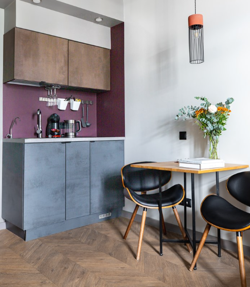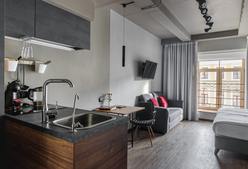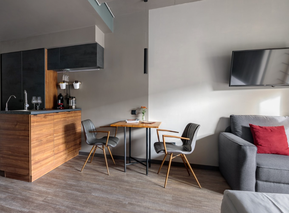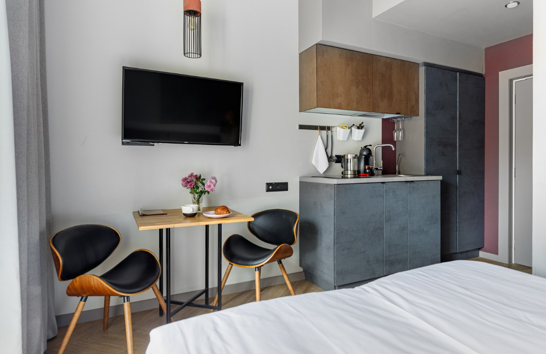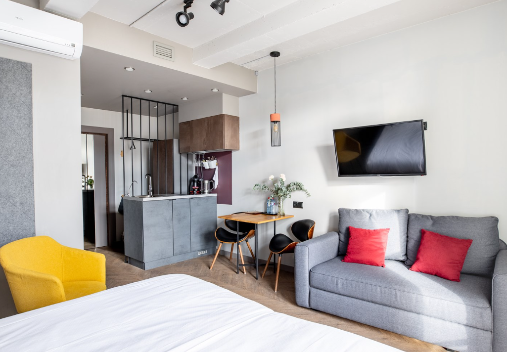 В номере: вешалка, диван, зеркало, кровать двуспальная, стол, стулья, шкаф, микроволновая печь, мини-холодильник, набор посуды, плита электрическая, сплит-система, телевизор, электрочайник