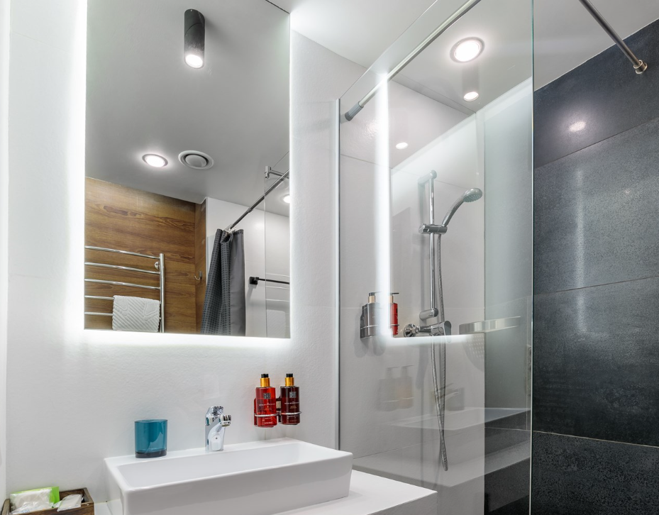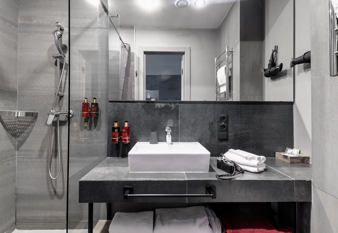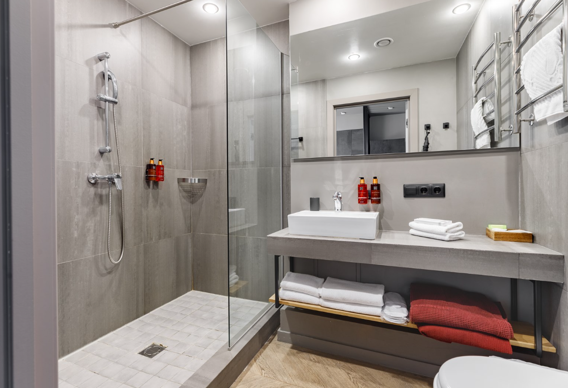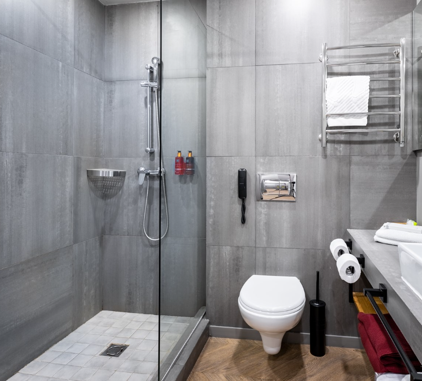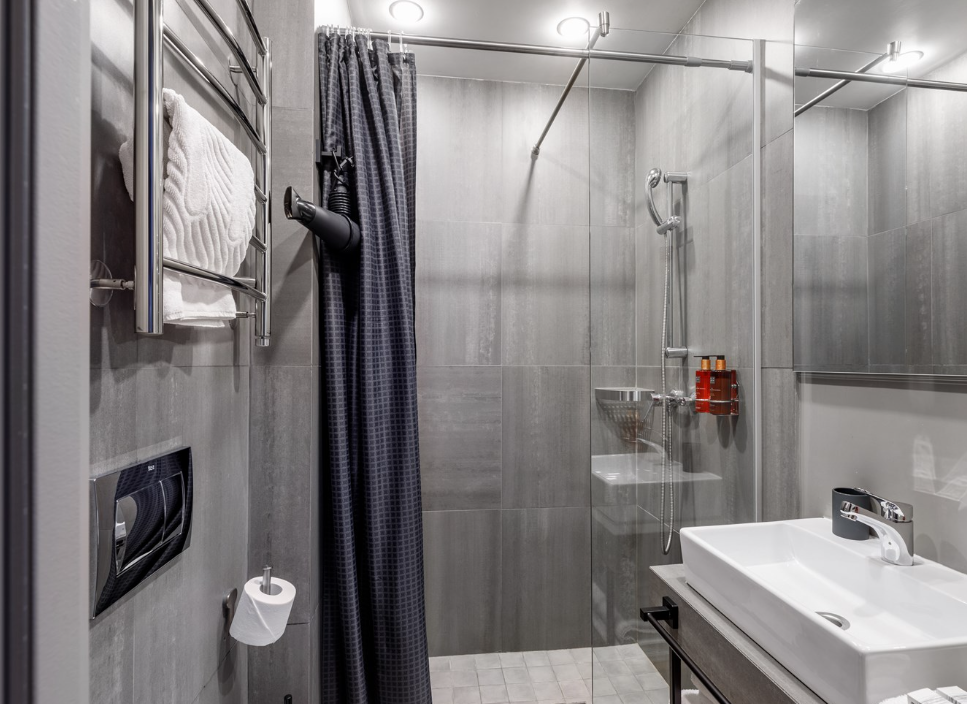 Санузел: с душем, тапочки, туалетные принадлежности, фен, халат
