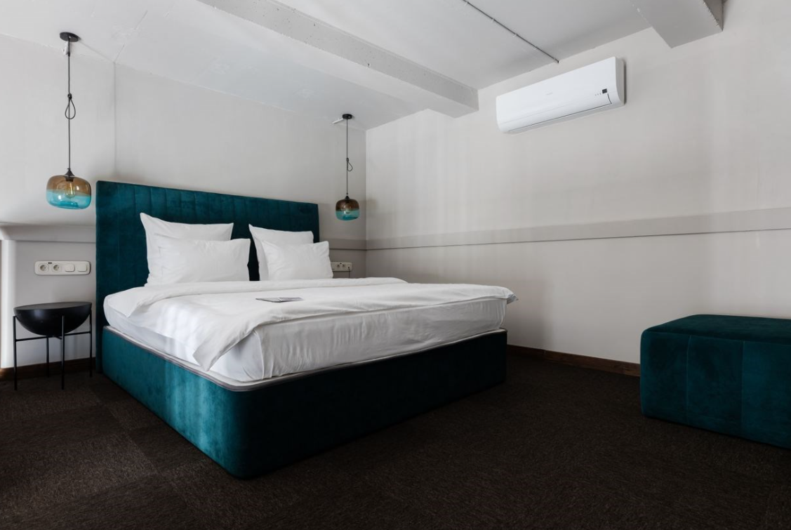 В номере: вешалка, диван, зеркало, кровать двуспальная, прикроватные тумбочки, стол, стулья, шкаф, гладильная доска, микроволновая печь, мини-холодильник, набор посуды, плита электрическая, сплит-система, телевизор, утюг, электрочайник