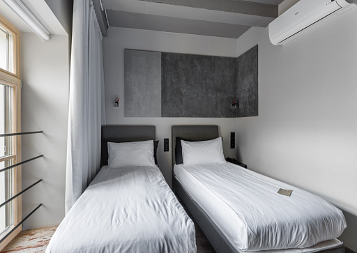 В номере: вешалка, диван, зеркало, кровати односпальные, прикроватные тумбочки, стол, стулья, шкаф, микроволновая печь, мини-холодильник, набор посуды, плита электрическая, сплит-система, телевизор, электрочайник