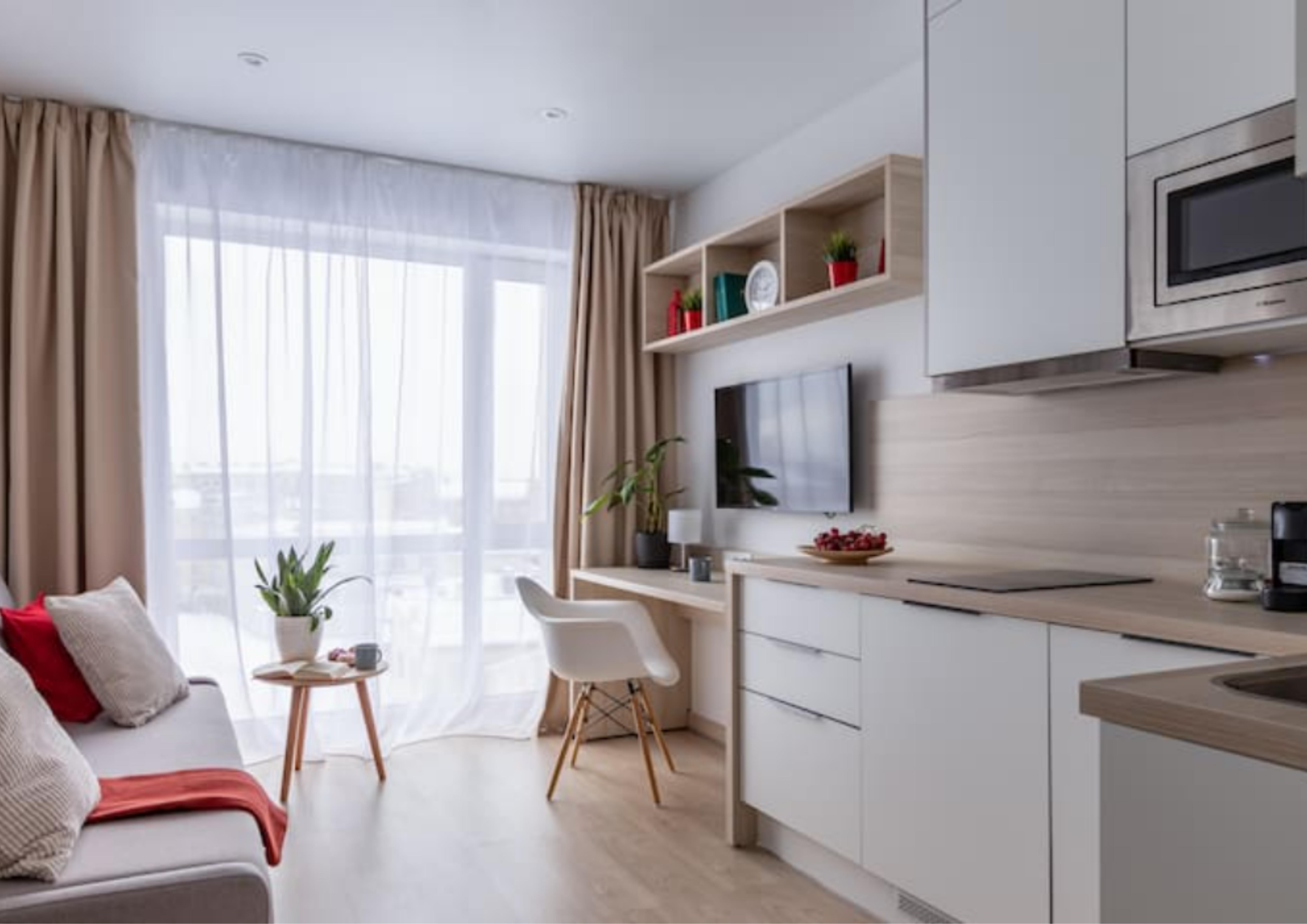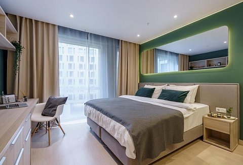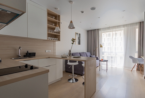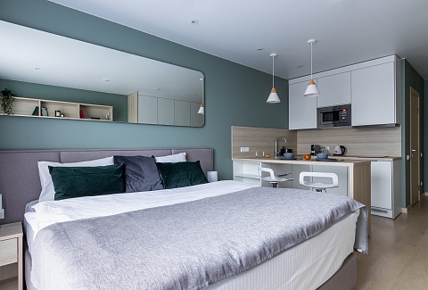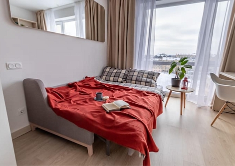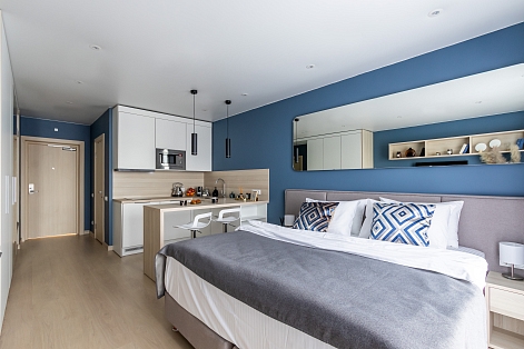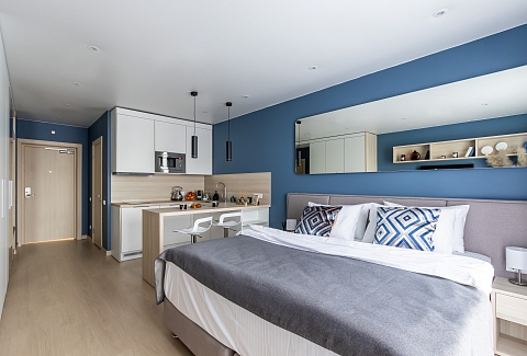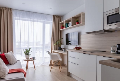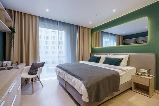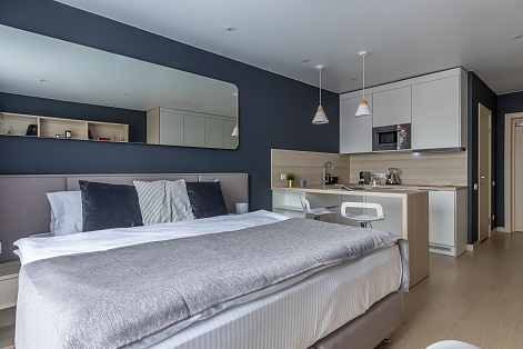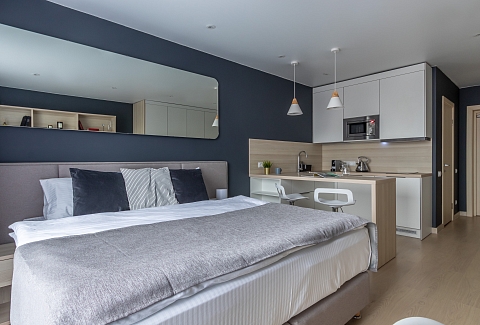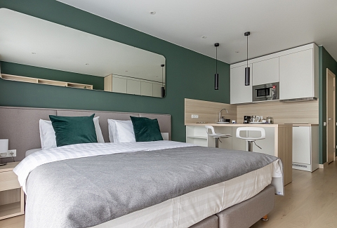 Апартаменты разместились в современном девятиэтажном здании, оснащенном лифтами. В распоряжении гостей 2-х и 4-х местные номера со стильными светлыми интерьерами. Все апартаменты оснащены собственной ванной комнатой, мини-кухней с электроплитой, также есть стиральная машина, телевизор с плоским экраном, микроволновая печь, электрочайник, кофемашина. В числе удобств – крытая парковка, беспроводной интернет, а также лобби-бар.
