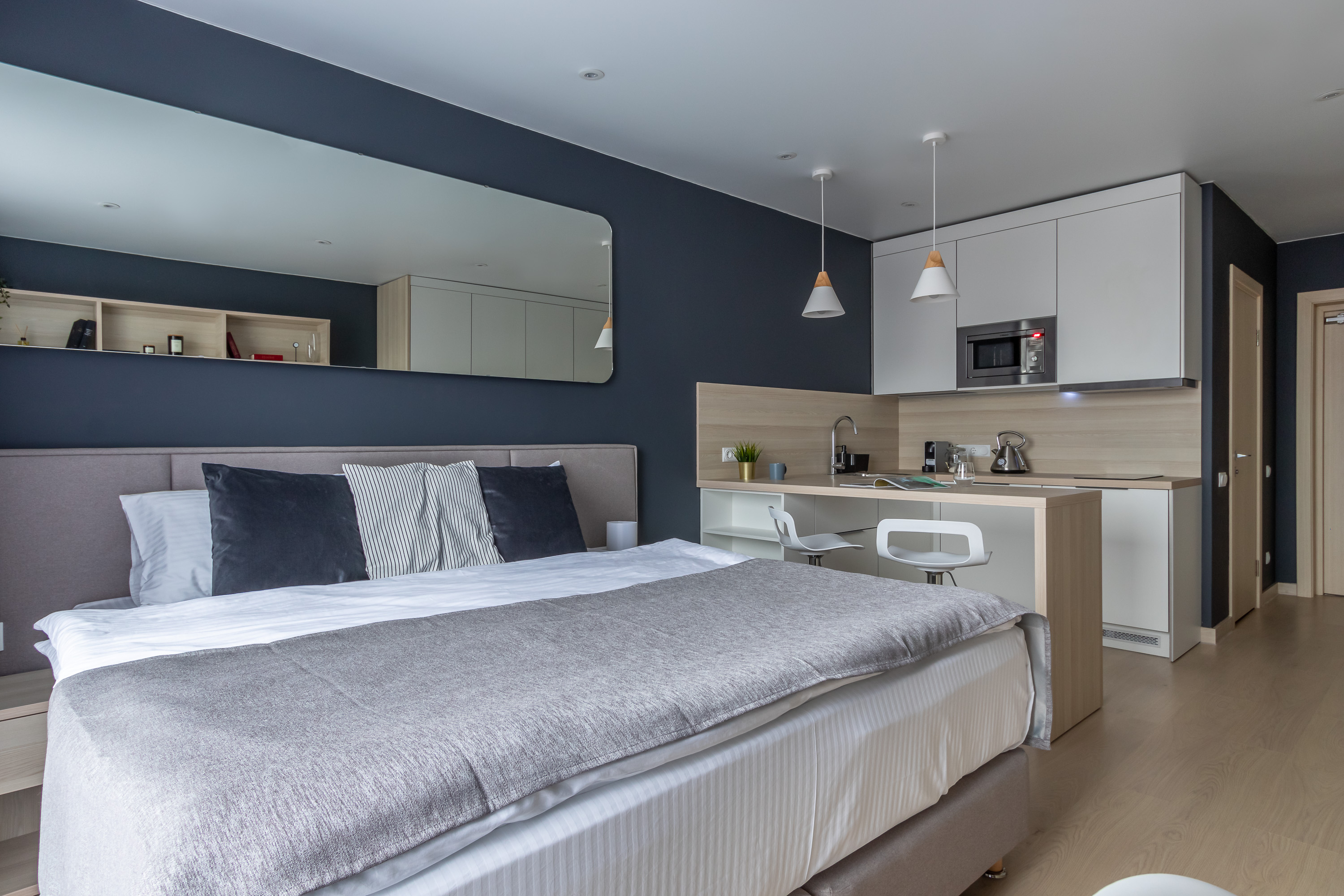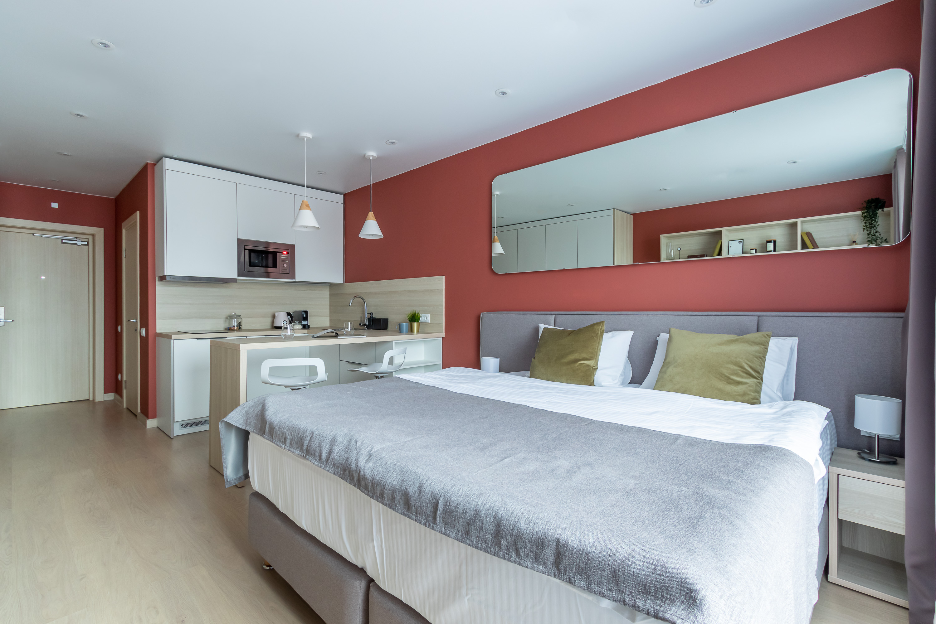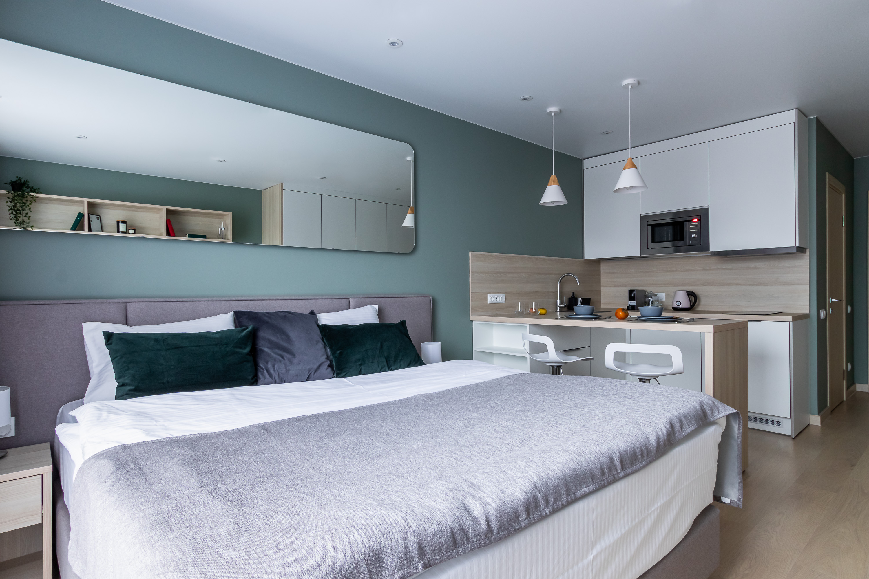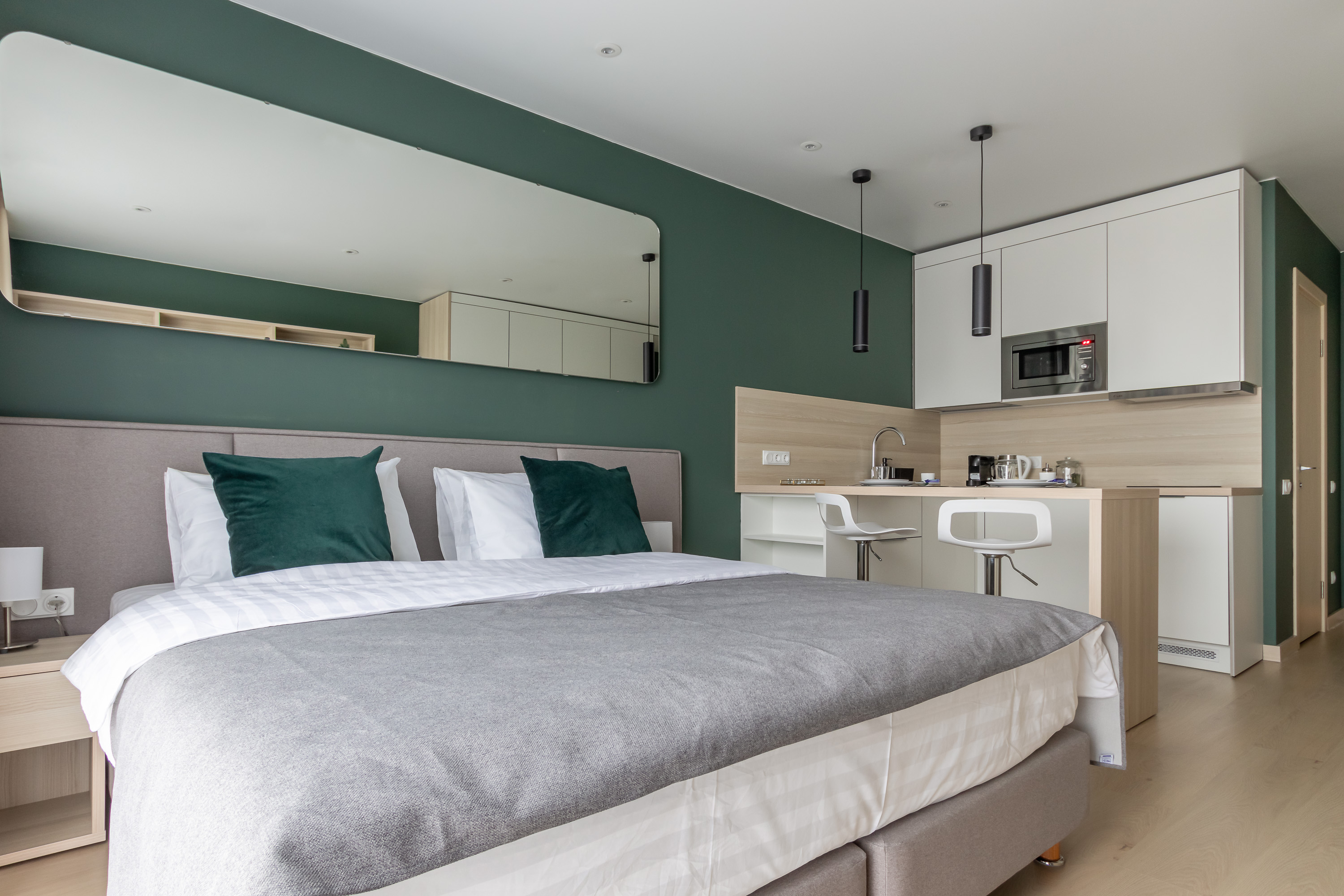 В номере: кровать двуспальная, кухонная мебель, прикроватные тумбочки, стол, стул, шкаф, кофемашина, микроволновая печь, набор посуды, плита электрическая, стиральная машина, телевизор, холодильник, электрочайник