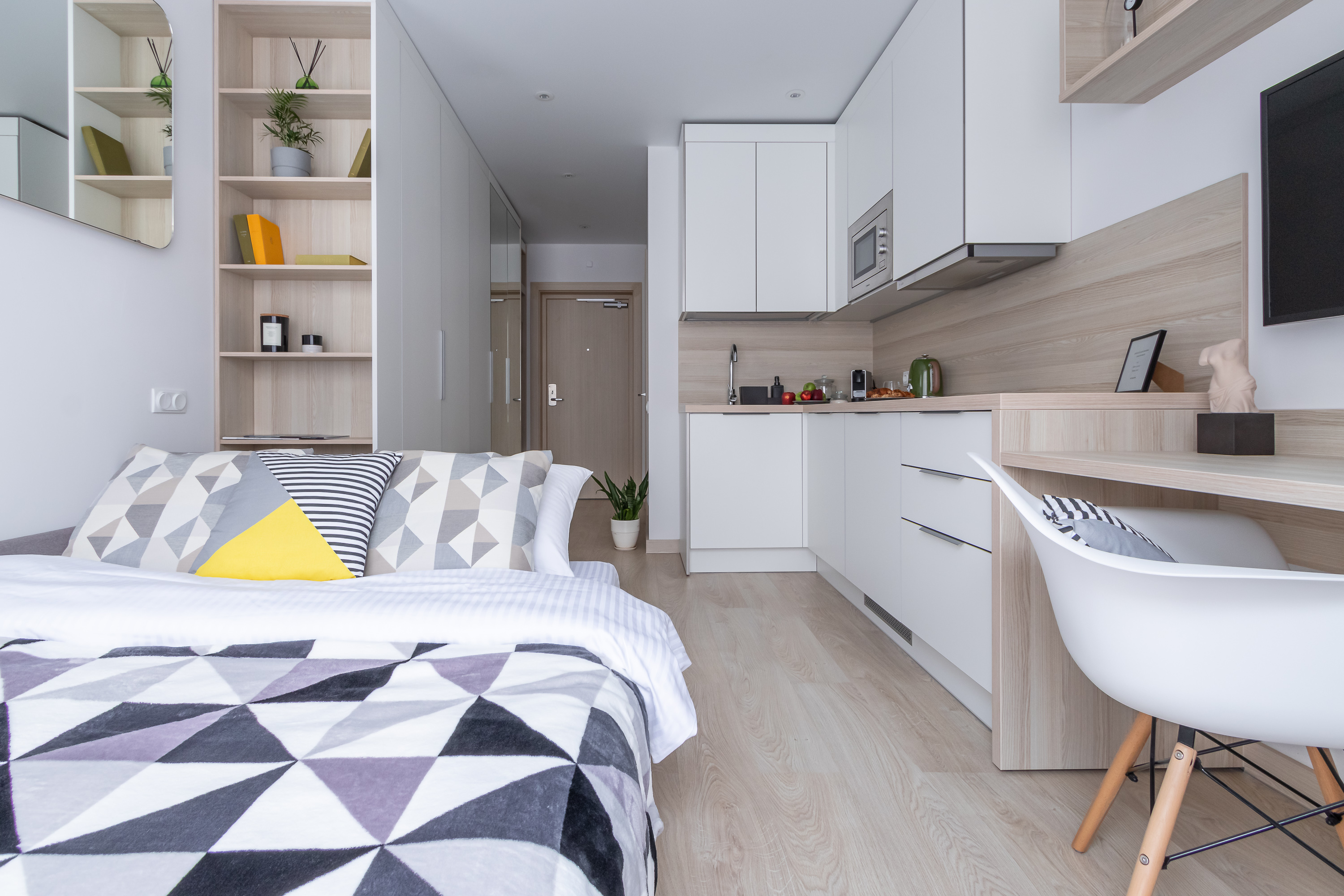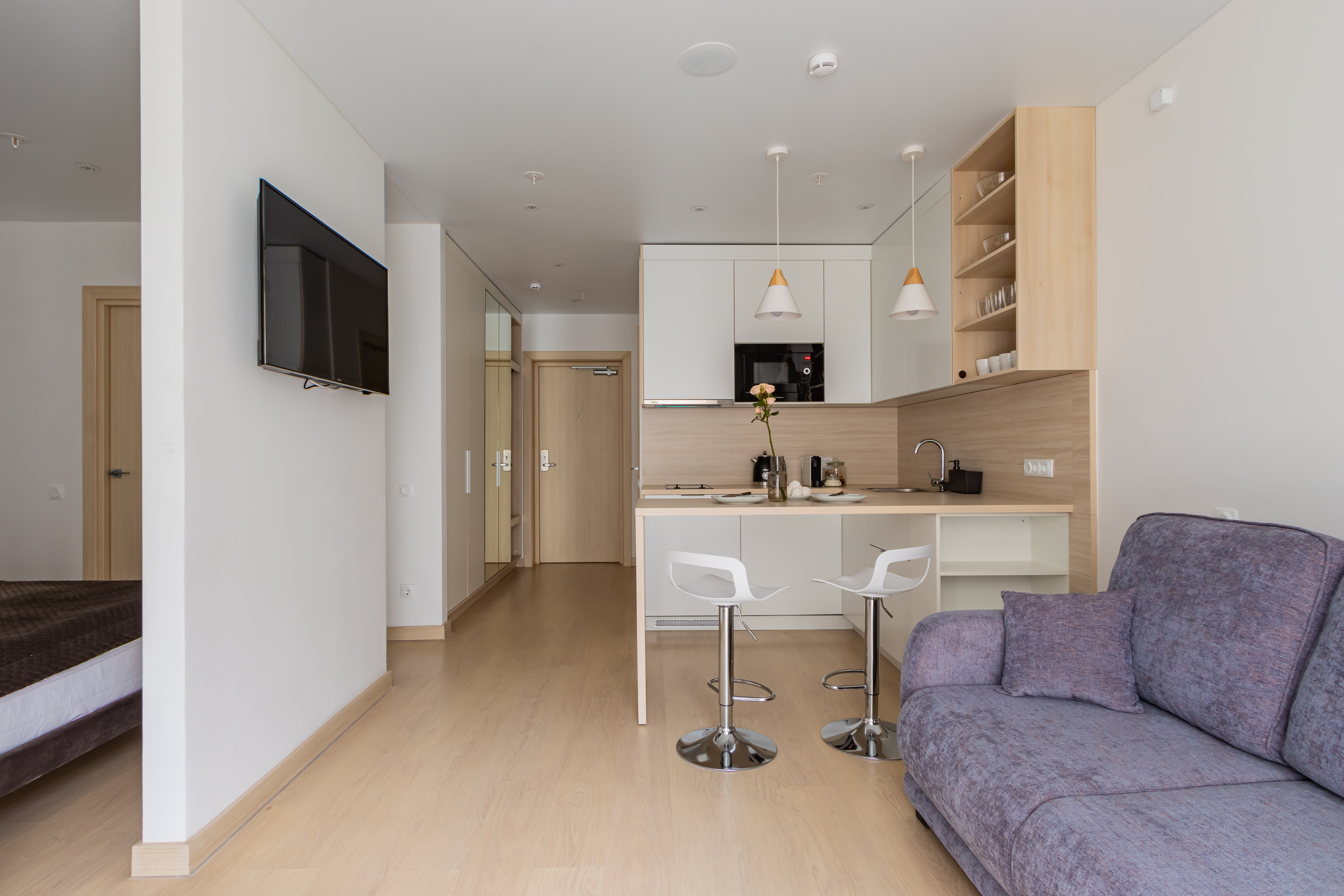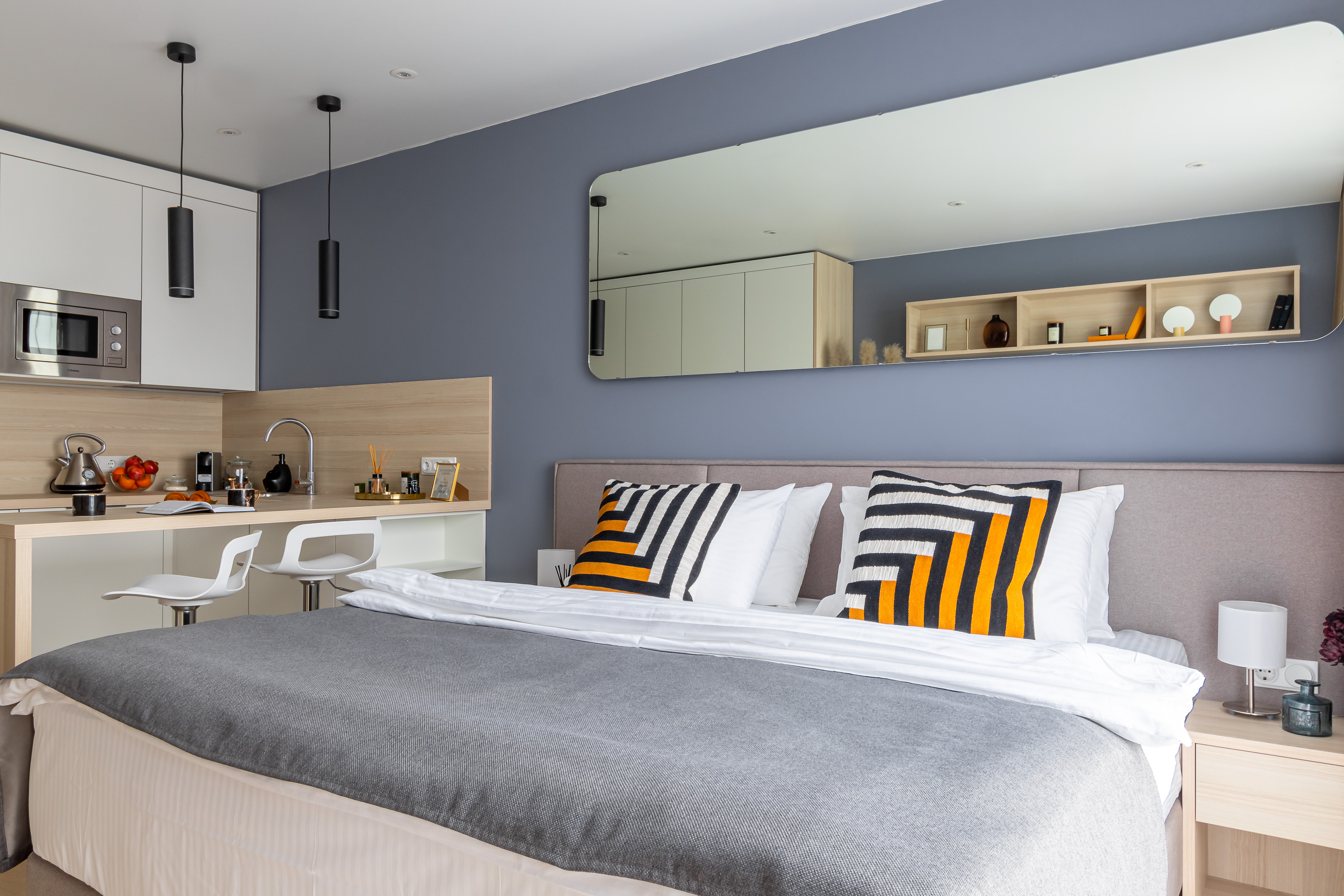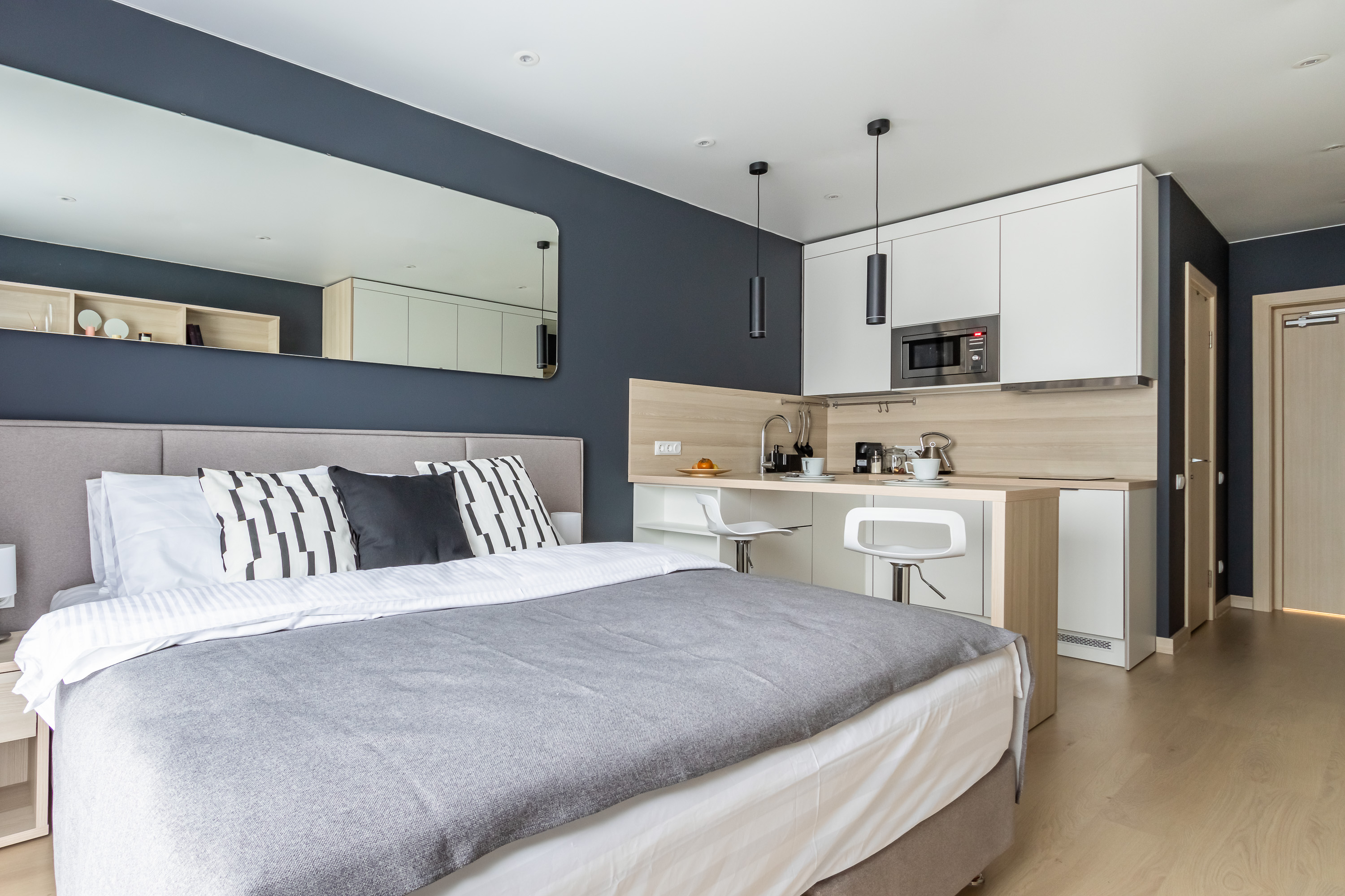 В номере: кровать двуспальная, кухонная мебель, прикроватные тумбочки, стол, стул, шкаф, кофемашина, микроволновая печь, набор посуды, плита электрическая, стиральная машина, телевизор, холодильник, электрочайник