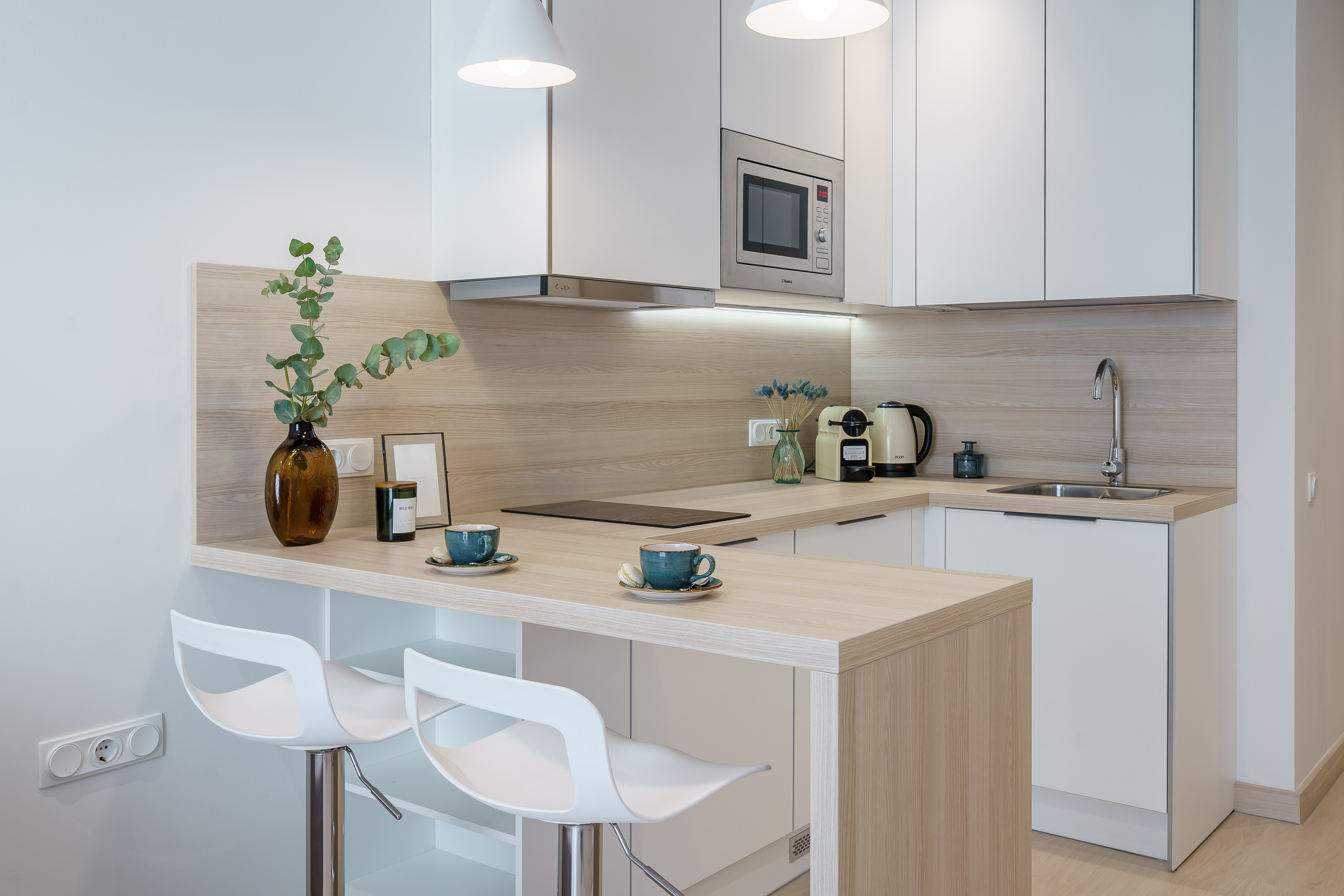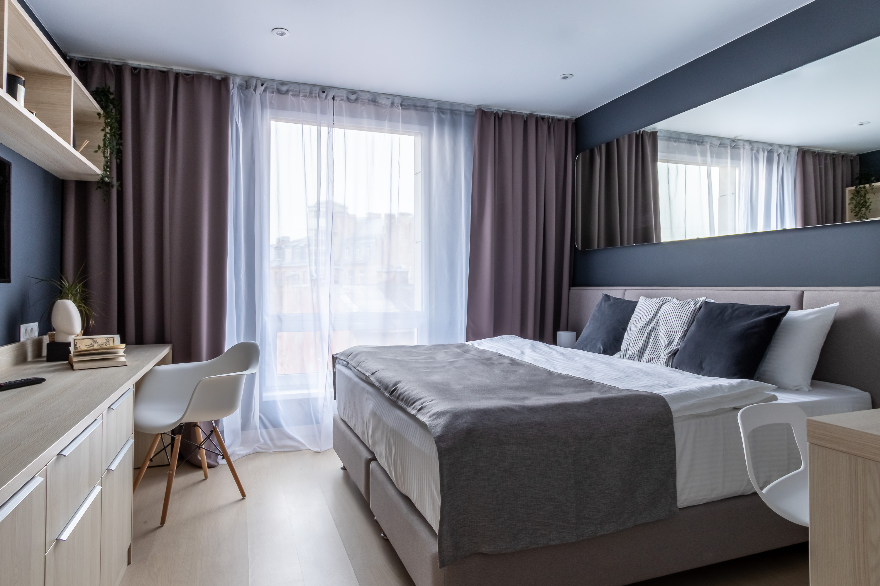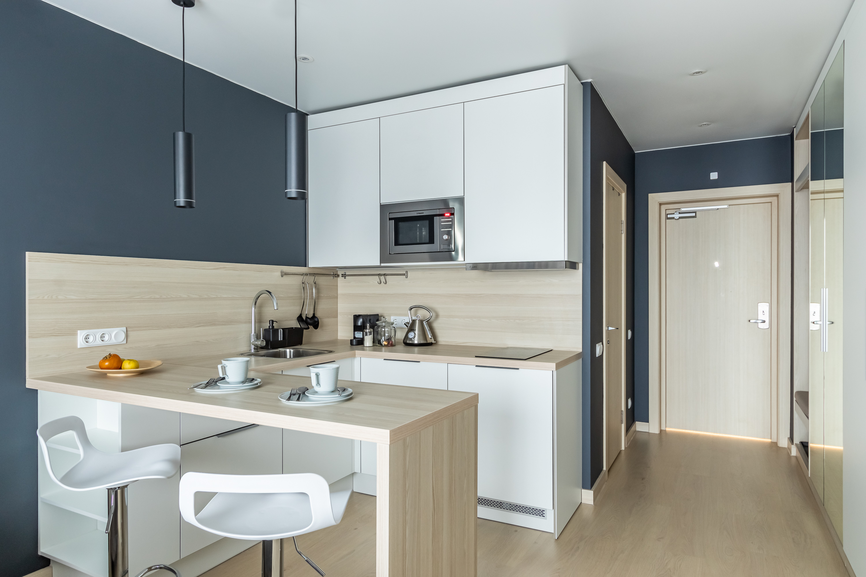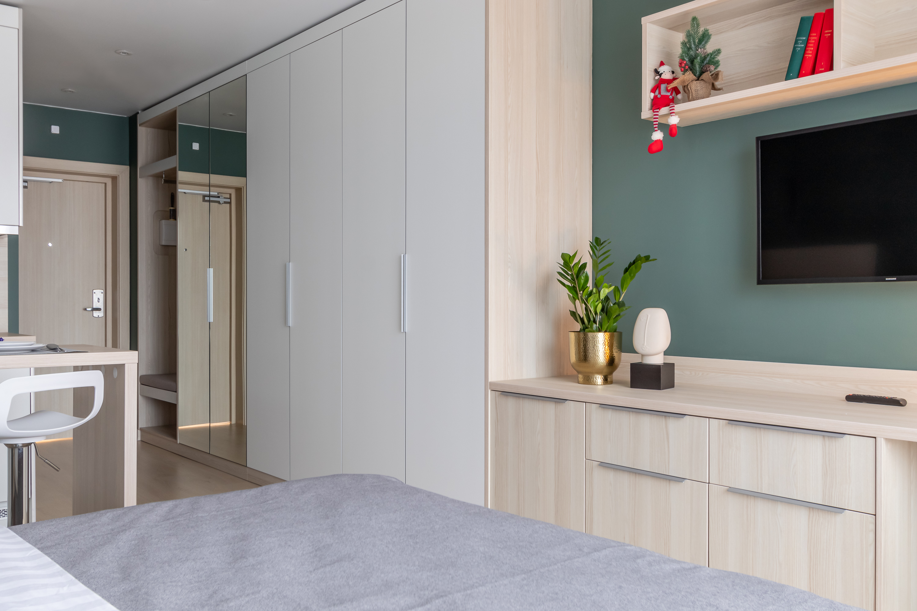 В номере: кровать двуспальная, кухонная мебель, прикроватные тумбочки, стол, стул, шкаф, кофемашина, микроволновая печь, набор посуды, плита электрическая, стиральная машина, телевизор, холодильник, электрочайник