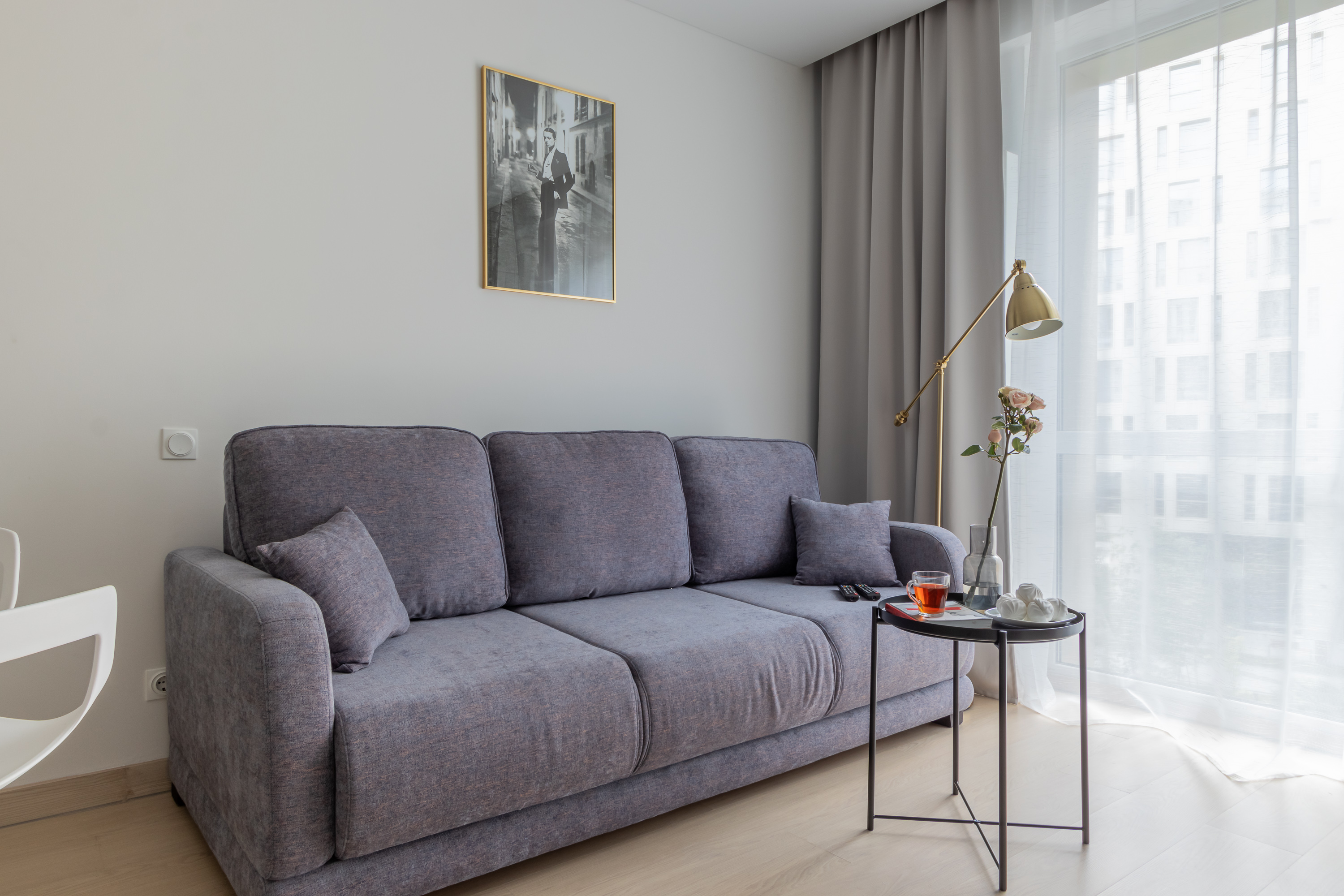 В номере: диван раскладной, прикроватные тумбочки, стол, стул, шкаф, кофемашина, микроволновая печь, набор посуды, плита электрическая, стиральная машина, телевизор, холодильник, электрочайник