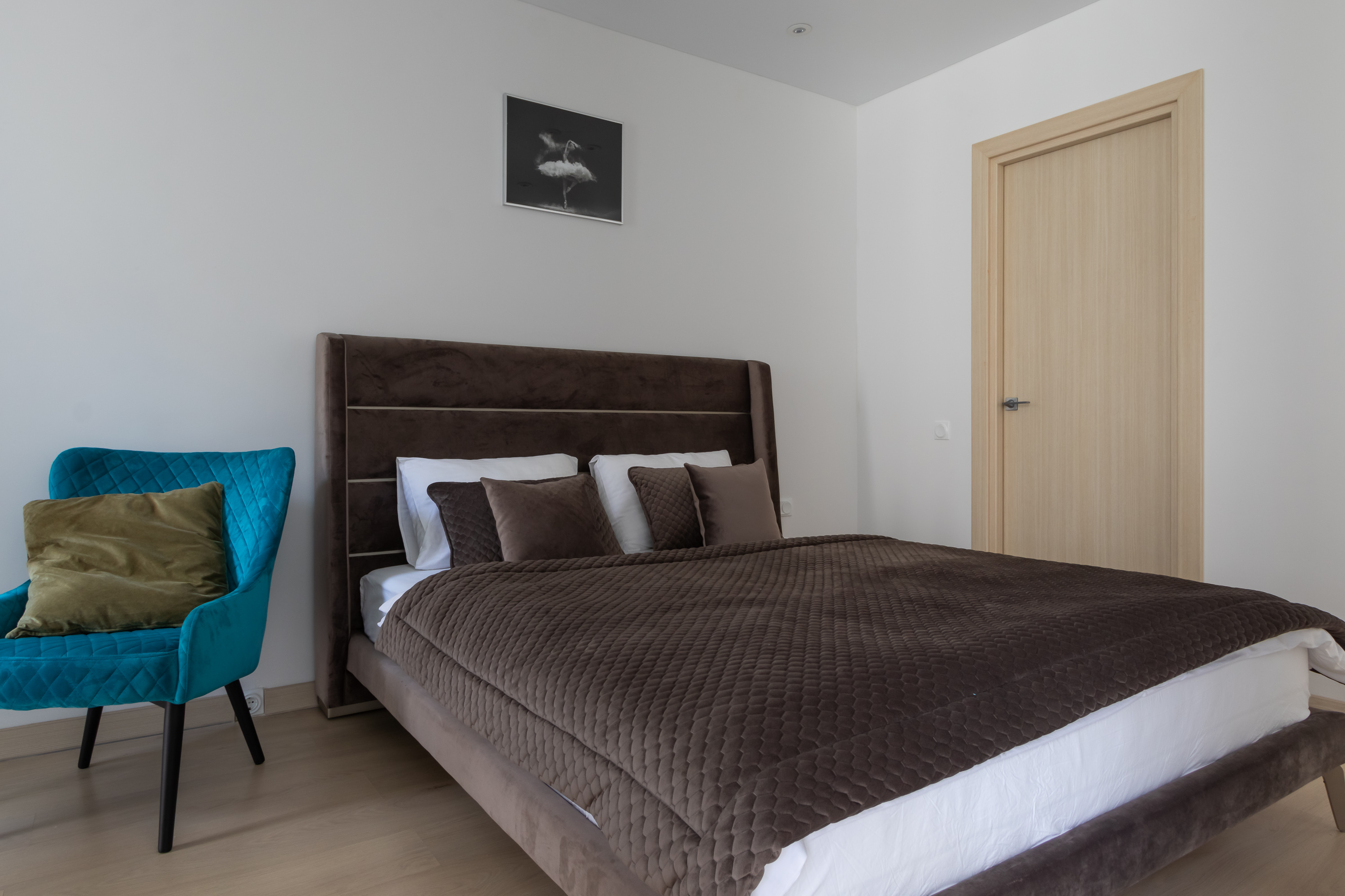 В номере: гардеробная, кресло, кровать двуспальная, кухонная мебель, прикроватные тумбочки, стол, стул, кофемашина, микроволновая печь, набор посуды, плита электрическая, стиральная машина, телевизор, холодильник, электрочайник