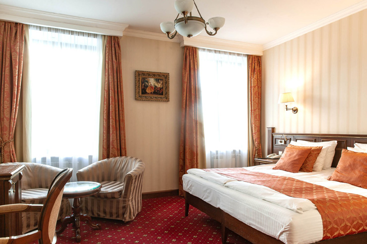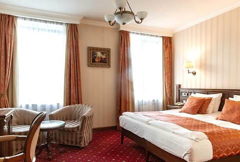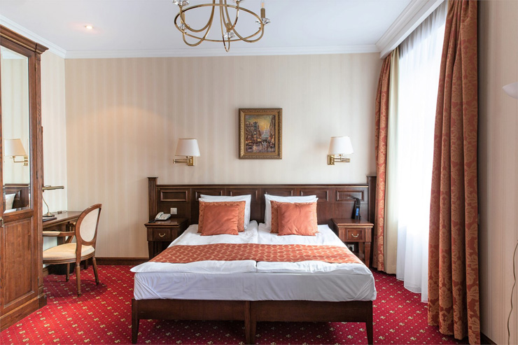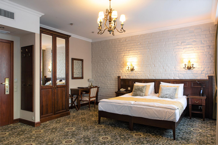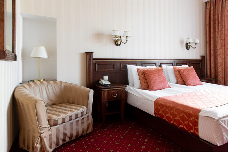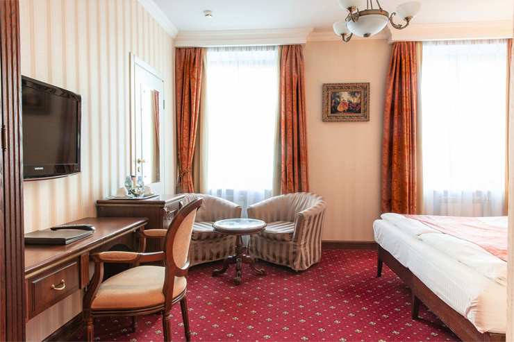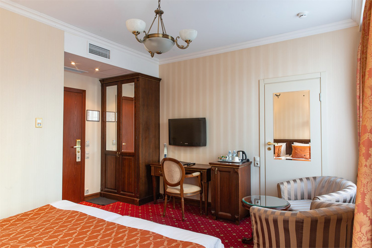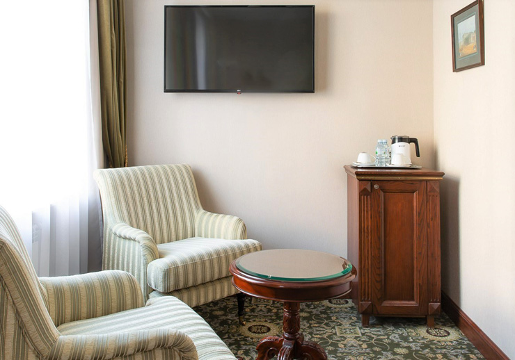 В номере: вешалка, диван, зеркало, кресло, кровать двуспальная, прикроватные тумбочки, стол, стул, шкаф, кондиционер, мини-холодильник, сейф, телевизор, телефон, чайная станция, чайный набор посуды