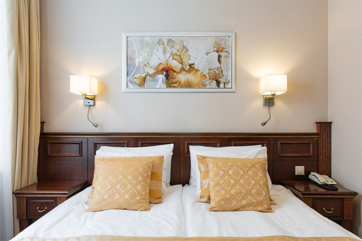 В номере: вешалка, зеркало, кровати односпальные /одна двуспальная кровать, прикроватные тумбочки, стол, стулья, шкаф, кондиционер, мини-холодильник, сейф, телевизор, телефон, чайная станция, чайный набор посуды