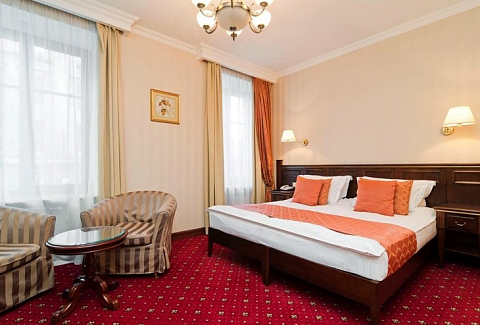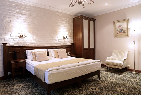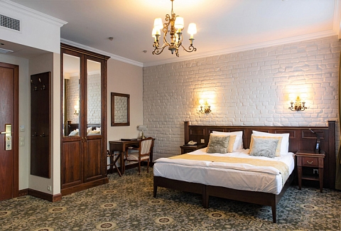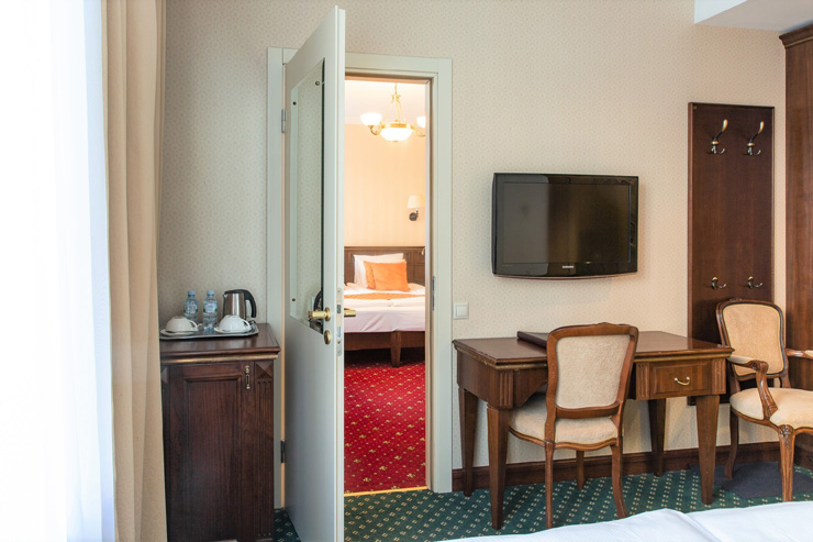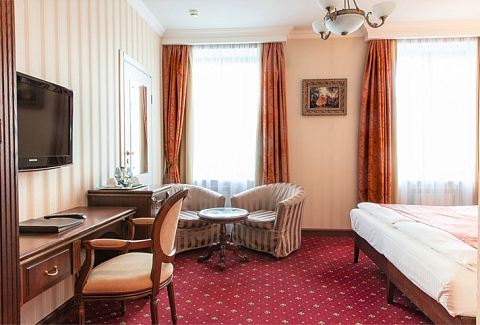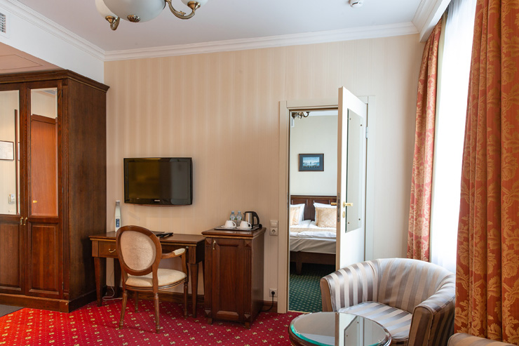 В номере: вешалка, зеркало, кресло, кровати односпальные /одна двуспальная кровать, кровать двуспальная, прикроватные тумбочки, стол, столик кофейный, стул, шкаф, кондиционер, мини-холодильник, сейф, телевизор, телефон, чайная станция, чайный набор посуды