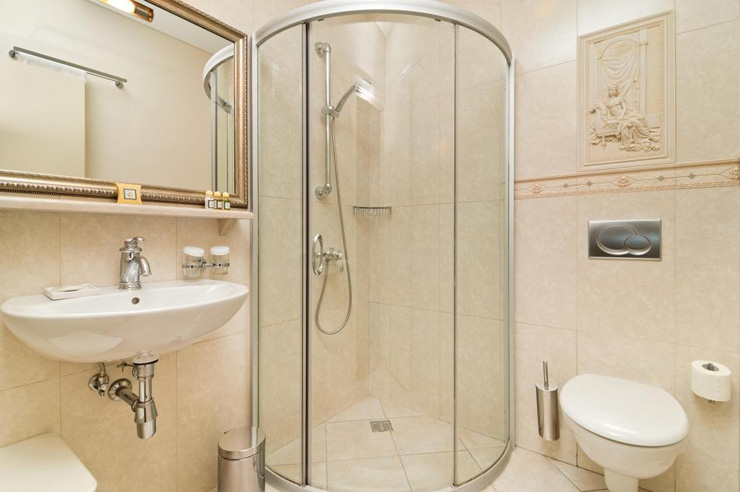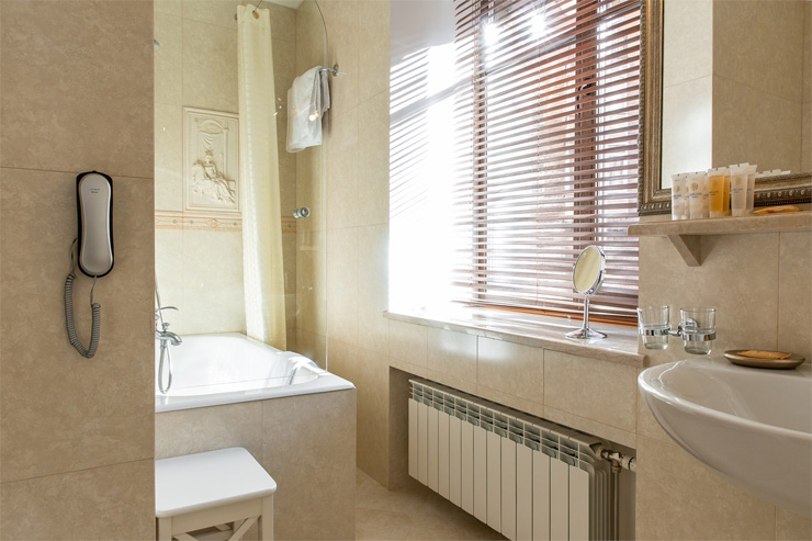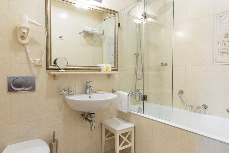 Санузел: с ванной или душевой кабиной, тапочки, туалетные принадлежности, фен, халат