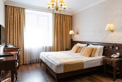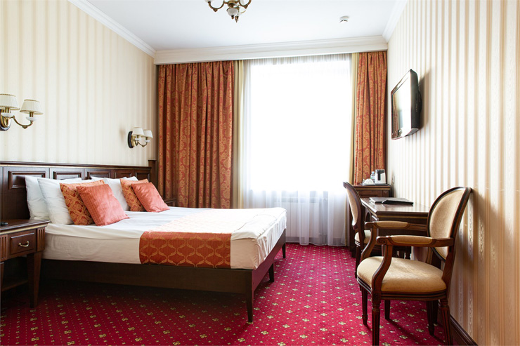 В номере: вешалка, зеркало, кровать двуспальная, прикроватные тумбочки, стол, стул, шкаф, кондиционер, мини-холодильник, сейф, телевизор, телефон, чайная станция, чайный набор посуды